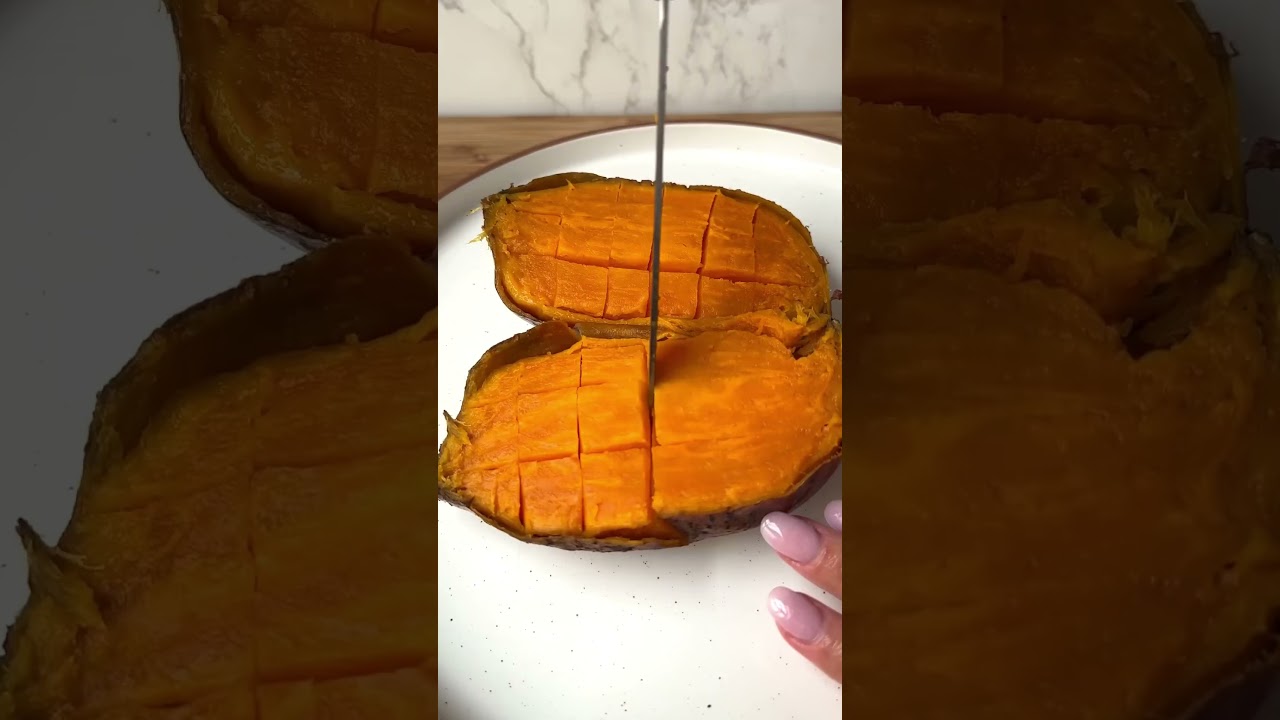 -Cut the baked sweet potato in half lengthwise. Score the flesh with a knife at ½-inch intervals, then spread the butter over both sides. Sprinkle with the cinnamon and the sugar mixture.
