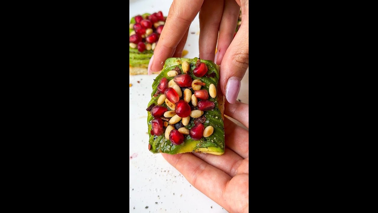 -Top the avocado with lemon juice, salt, black pepper, honey, red pepper flakes, the toasted pine nuts, and pomegranate arils. Carefully place the poached egg on top of one of the avocado toast squares.