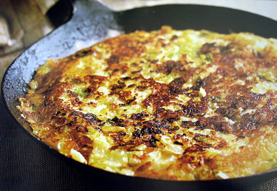 5. Invert a large plate over the pan, and, holding it tightly against the pan, turn them both over together. Left off the frying pan, return it to the heat and add the remaining bacon fat or oil. When hot, slide the cake back into the pan, browned side uppermost.