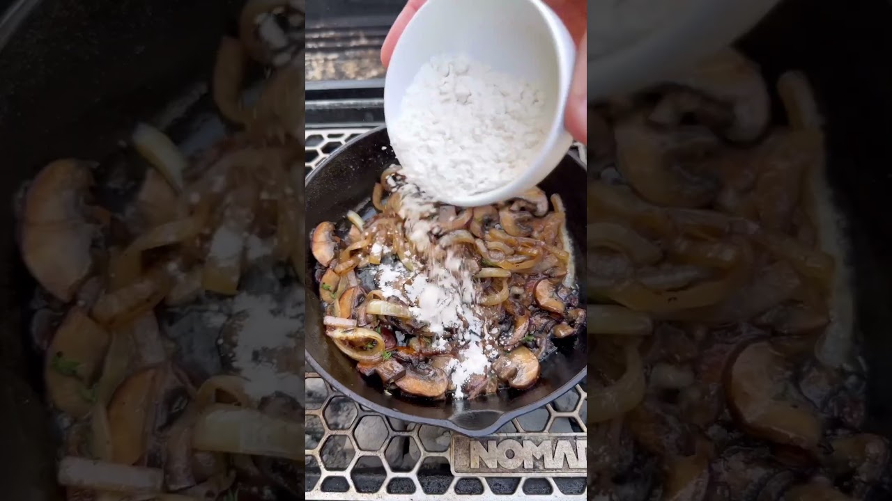 •Add 2 tablespoons butter, half of a sliced yellow onion, and 4 ounces sliced portobello mushrooms to a large skillet and cook over high heat for 5 minutes, until the vegetables begin to soften. Add 1 teaspoon fresh thyme leaves and ½ teaspoon each salt and pepper. Sprinkle with 1 tablespoon flour, stirring to coat, and cook for 2 minutes. Add 2 teaspoons Worcestershire sauce, ¼ cup red wine, and ½ cup heavy cream and cook until the sauce thickens.
