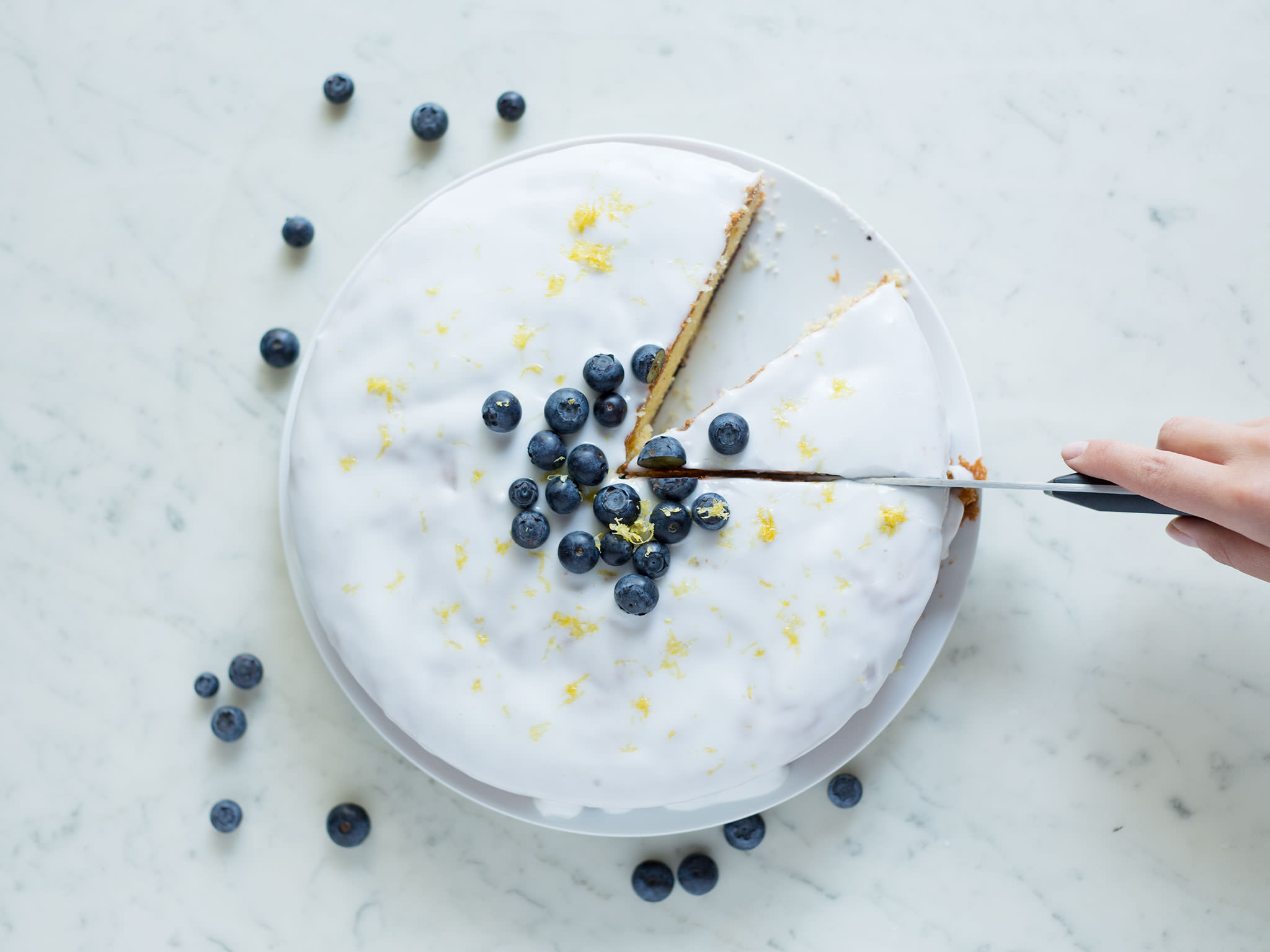 For the icing, whisk together confectioner’s sugar and juice from the remaining lemon. Evenly spread over cake. Garnish with the remaining blueberries and remaining lemon zest.