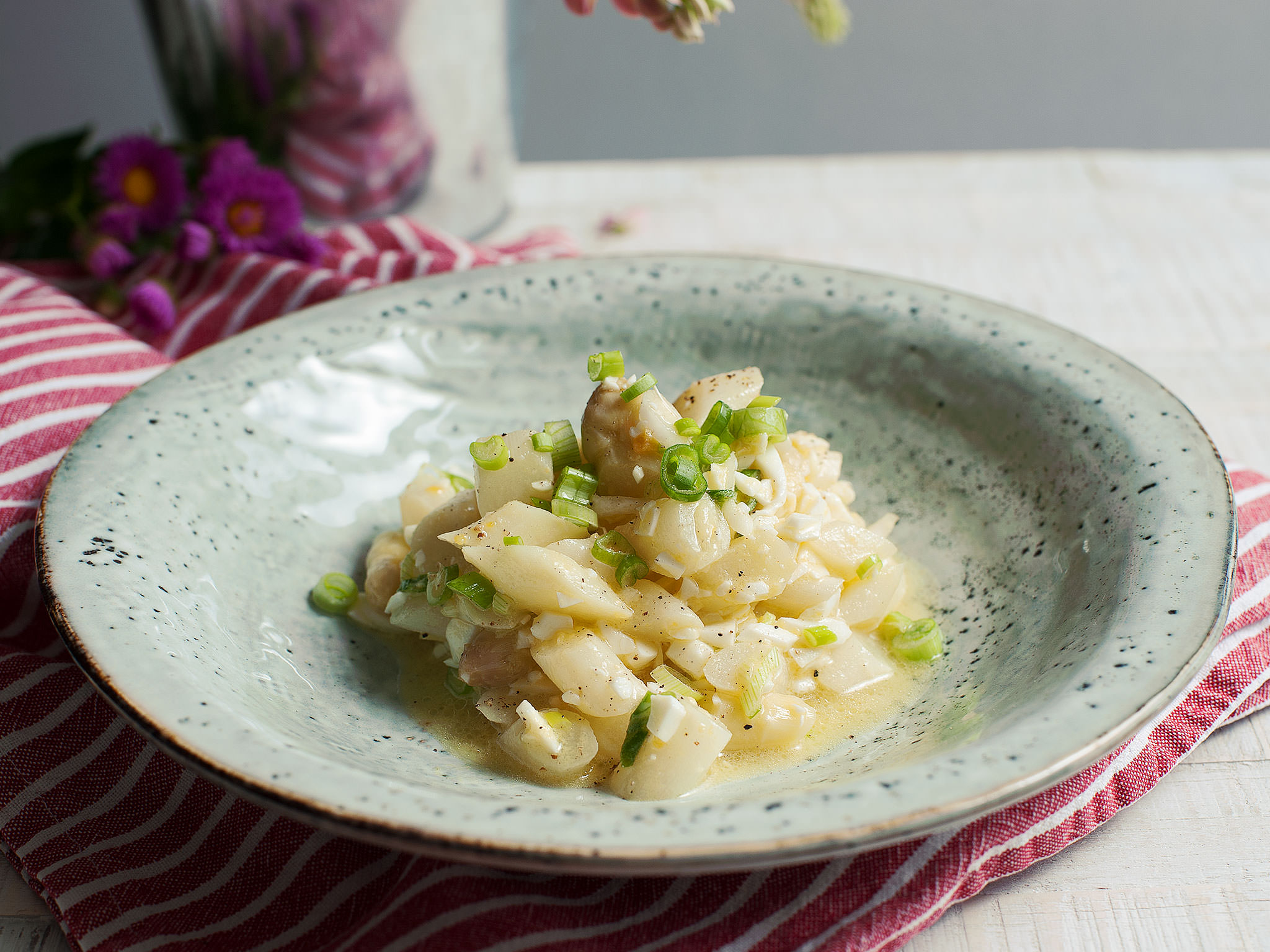 Cut green onion into fine rings. Separate egg white and yolk and cut into small cubes. Cut asparagus into bite-sized pieces.