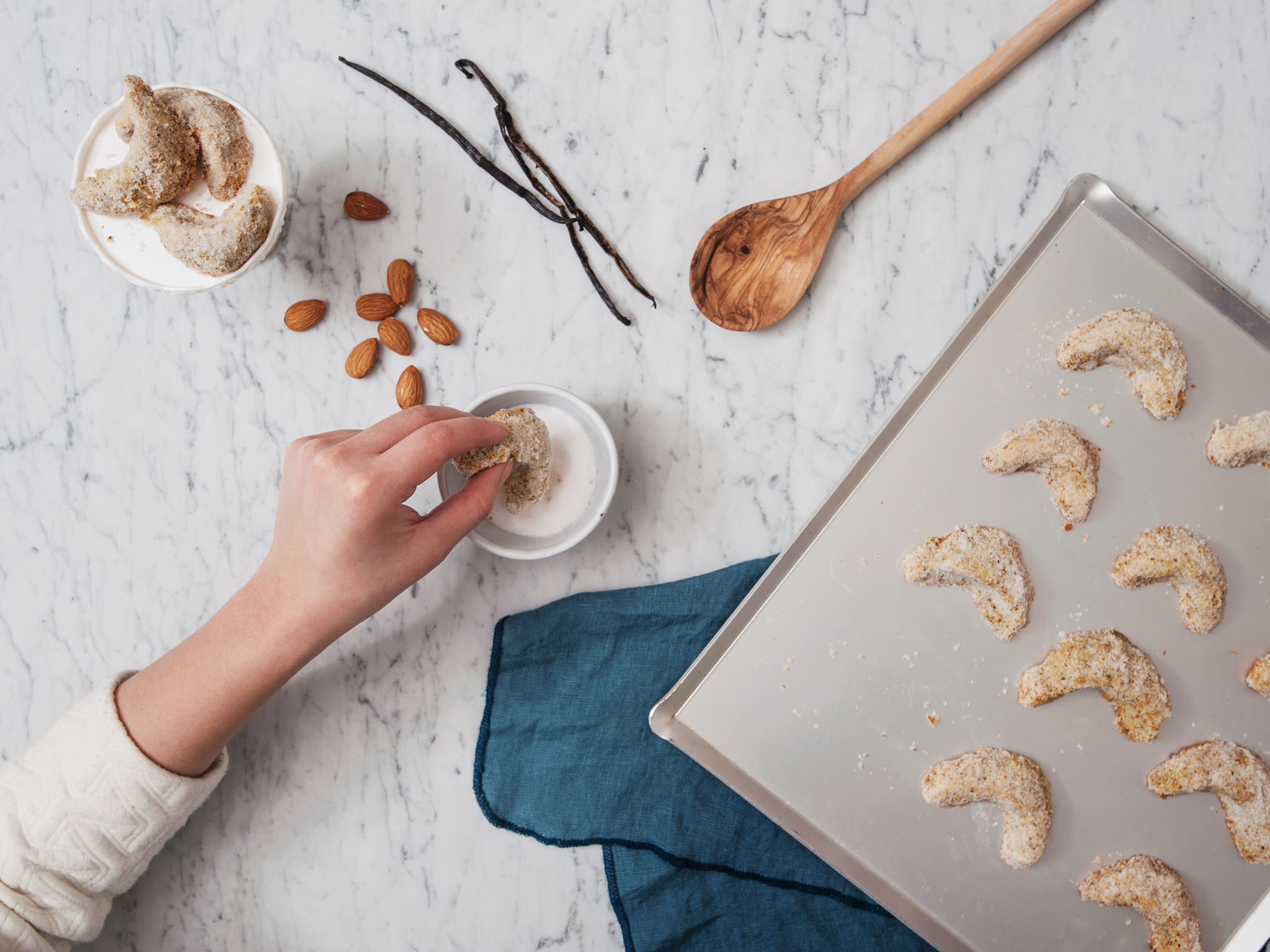 Knead dough to a ball and then form crescent shaped cookies. Place on a lined baking sheet and bake in a preheated oven at 170°C/335°F for approx. 8 – 10 min.