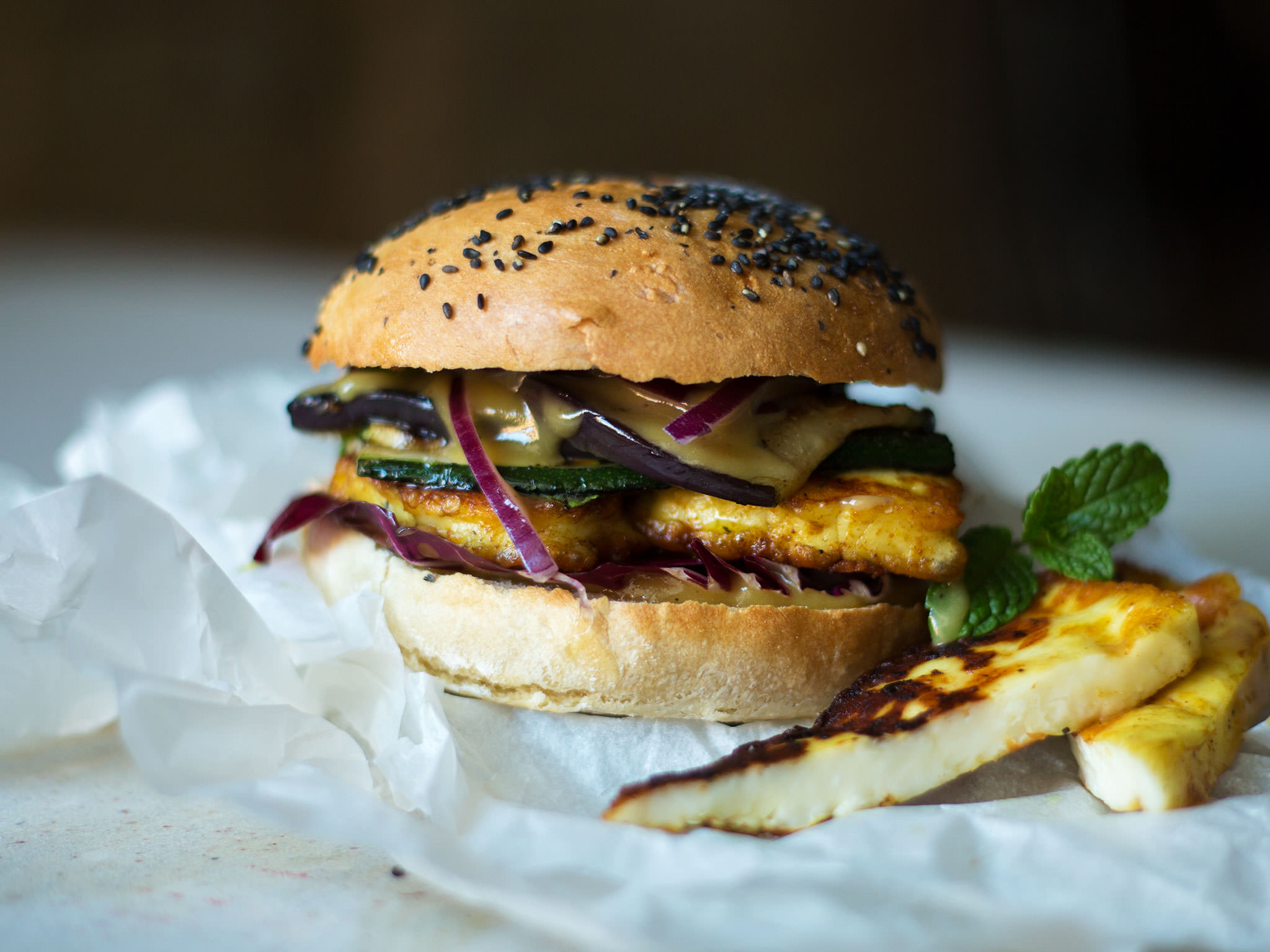 Brush each burger bun with honey mustard sauce. Place radicchio on the bottom part and layer cheese, zucchini, eggplant, and onion rings on top. Pick mint leaves and place on top of vegetables. Drizzle with more sauce, cover with the upper part of the bun, and enjoy with homemade french fries!