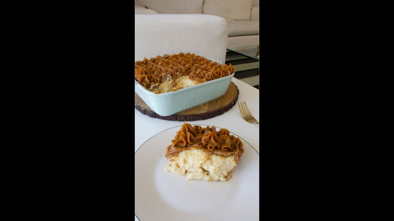 -Once the cake has cooled completely, trim the top layer with a serrated knife and make holes all over the cake using a chopstick or fork. Then pour the milk mixture evenly on top; the cake will absorb it. Cover with plastic wrap and refrigerate overnight. -The following day, pipe or spread the dulce de leche on top of the cake.. Keep the cake covered and refrigerated until ready to serve.