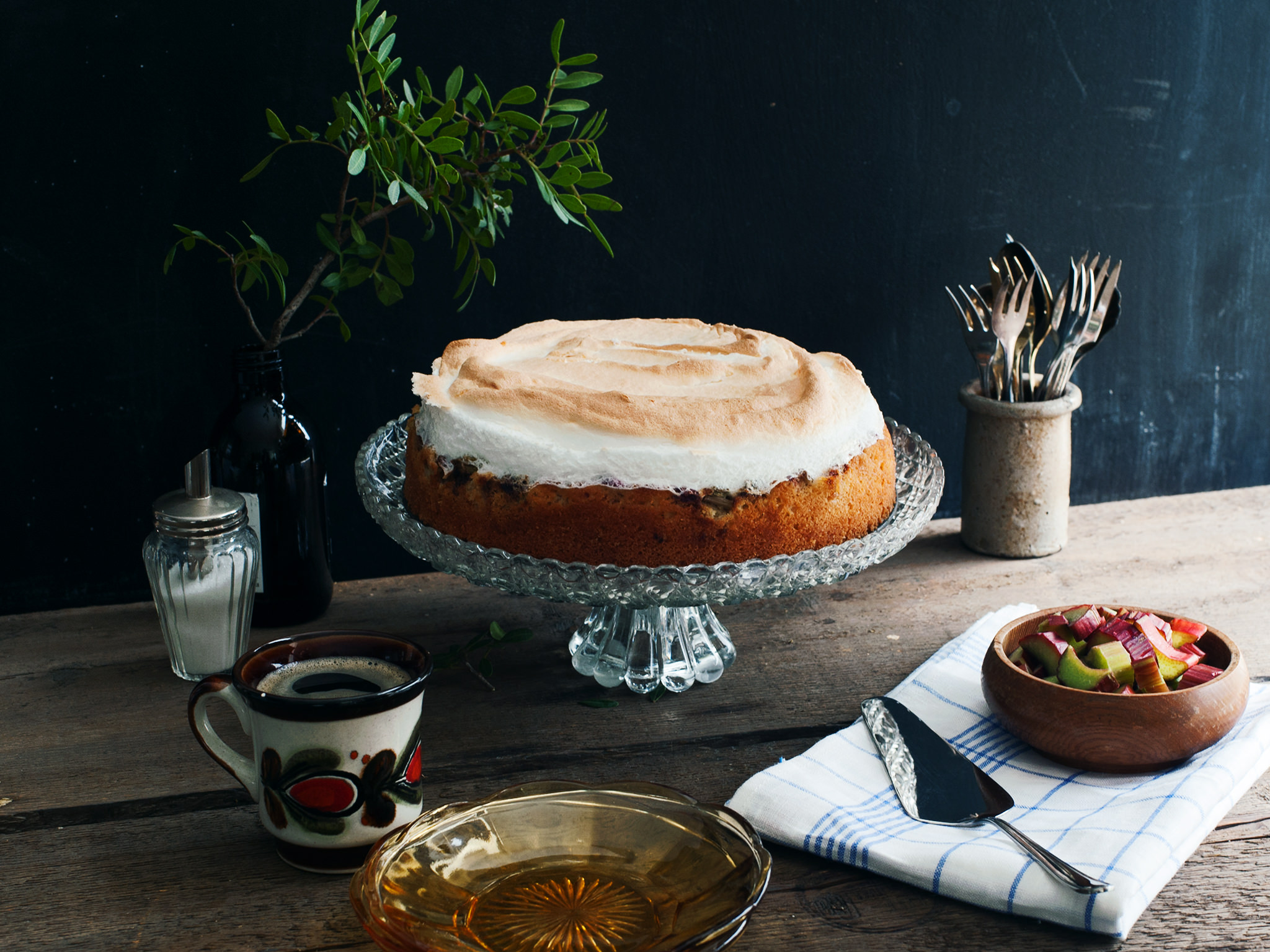 Spread meringue over rhubarb and return the cake to the oven for approx. 15 min., or until the meringue turns golden brown. Let the cake cool completely. Before removing it from the pan, run a sharp knife along the sides of the cake to loosen it. Enjoy!