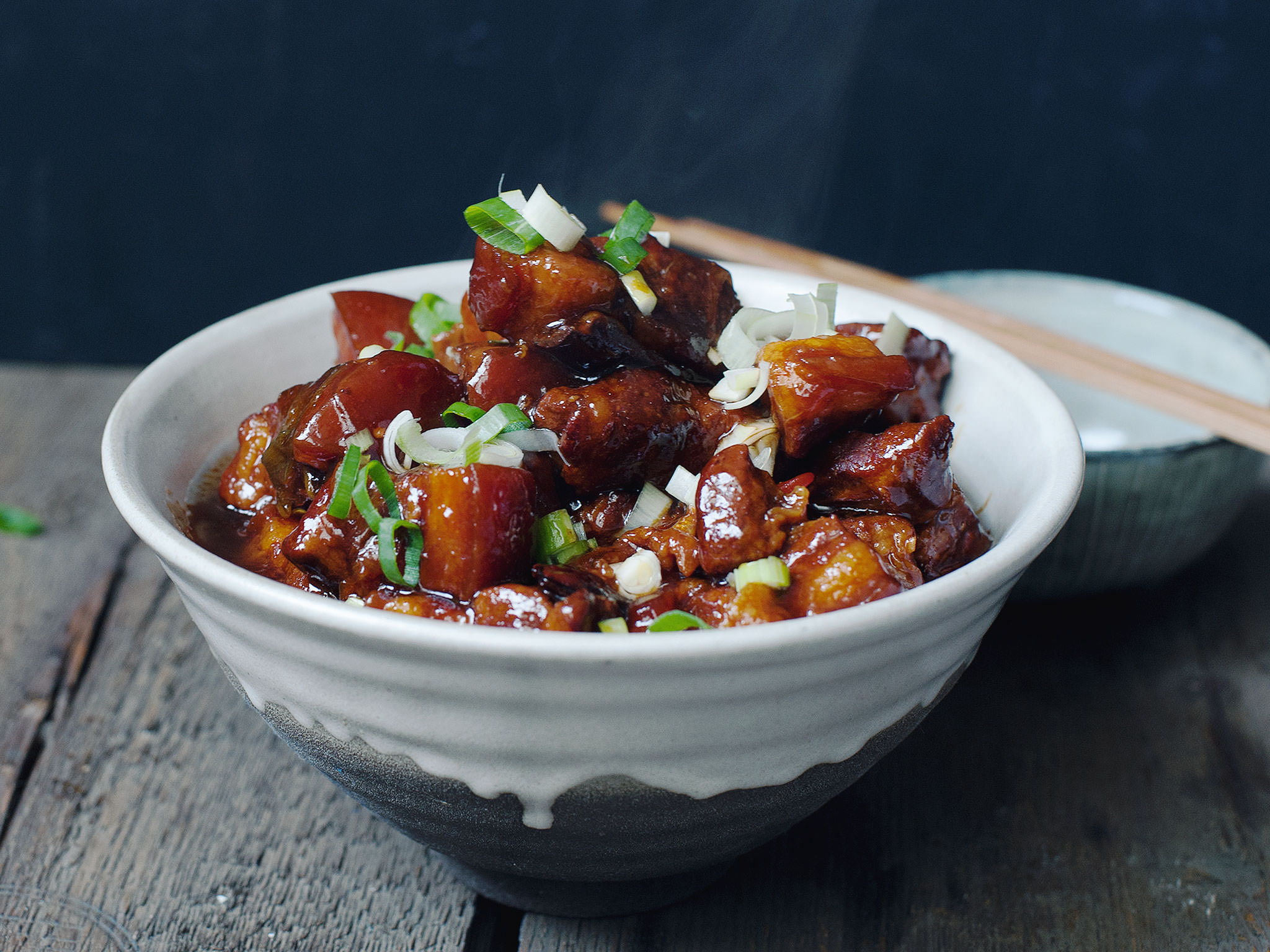 Heat oil over medium-high heat, return pork to pan, and cook until fat has rendered, approx. 4 – 6 min. Discard excess oil from pan and then add green onion, ginger, garlic, chilis, star anise, cinnamon, and bay leaves. Return caramelized sugar to pan and cook for approx. 1 – 2 min. until all ingredients are evenly coated in sugar. Next, add soy sauce, wine, tofu, and water. Reduce heat to low and cook for approx. 1 – 2 hrs. until volume has reduced by half and sauce has thickened. Enjoy with aromatic rice!