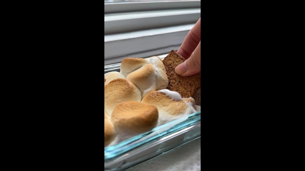 The recipe is quite simple – take a small baking dish and layer chocolate on the bottom (I used Hershey’s kisses, but you can also use chocolate chips or even a chocolate bar). Then, place large marshmallows on top and bake in the bottom third of the oven at 400°F (200°C) for 4-6 minutes, until the tops of the marshmallows are golden brown. Scoop up with graham crackers or cookies and enjoy!