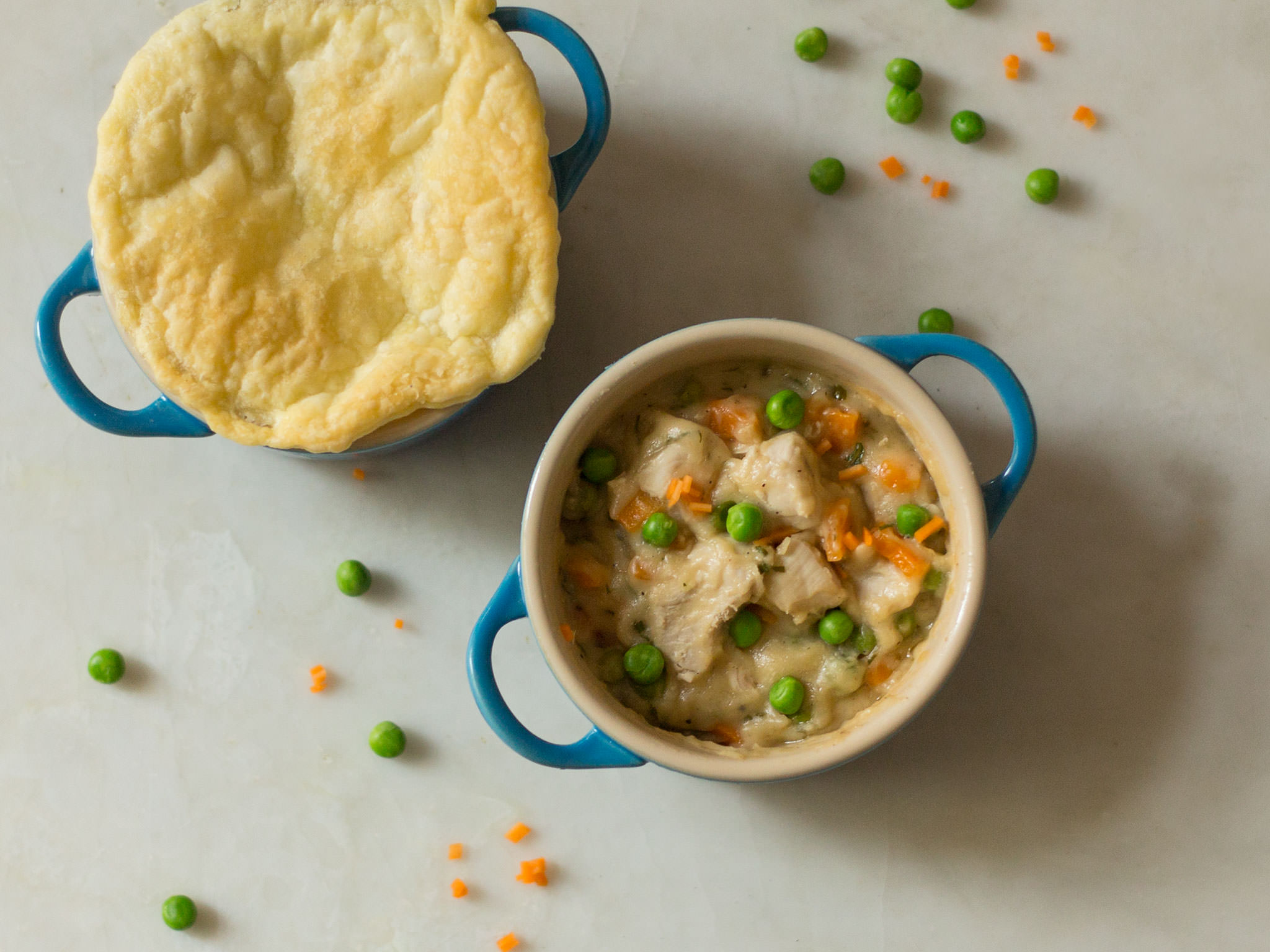 Evenly divide mixture among ramekins. Cut puff pastry into rounds slightly larger than the ramekins, place over the top, and press edges closed. Pierce center of puff pastry rounds with a knife. Bake in a preheated oven at 180°C/350°F for approx. 15 – 20 min. until pastry is golden. Enjoy!