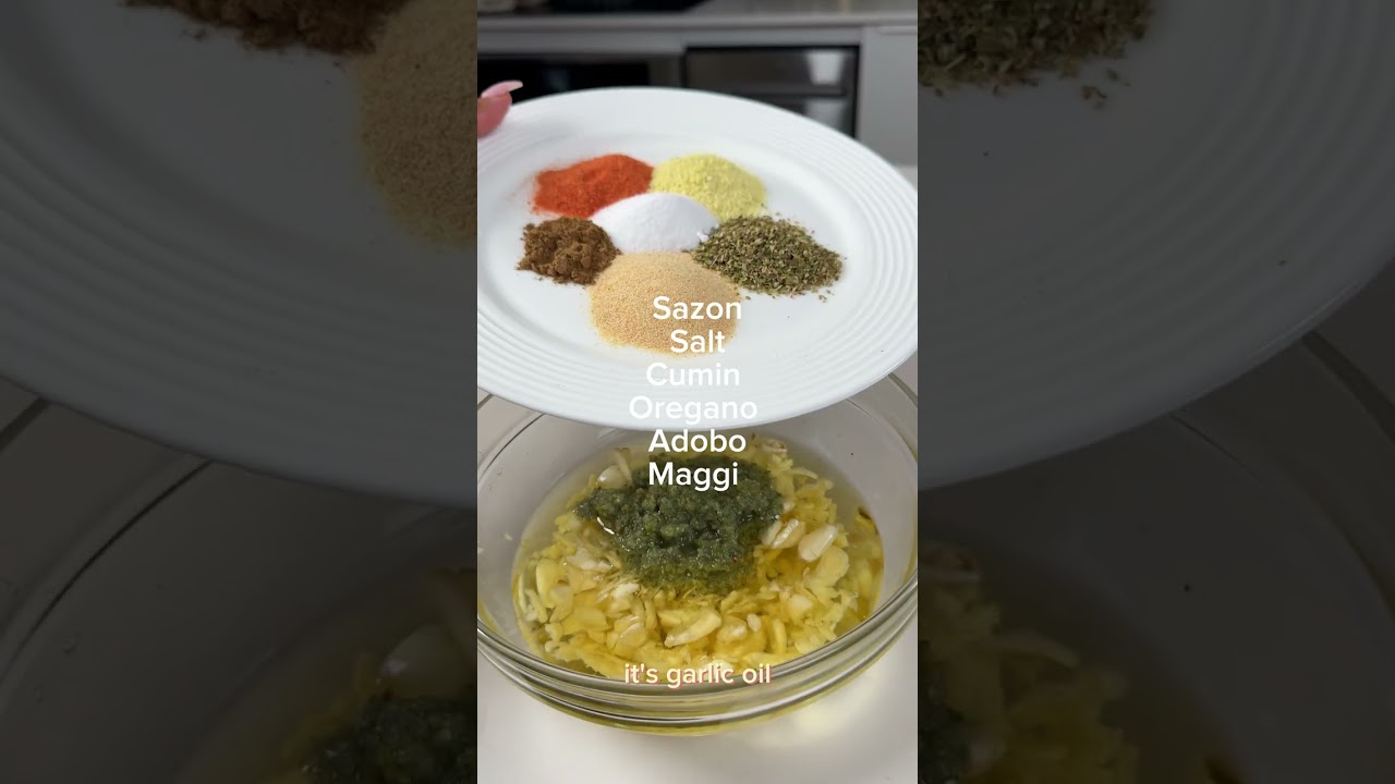 Make sure you get garlic in those holes you’re going to get the back and when you’re me is fully marinated it’s going to look like this for the top of the skin we’re just going to use saon and salt and you want to make sure that you