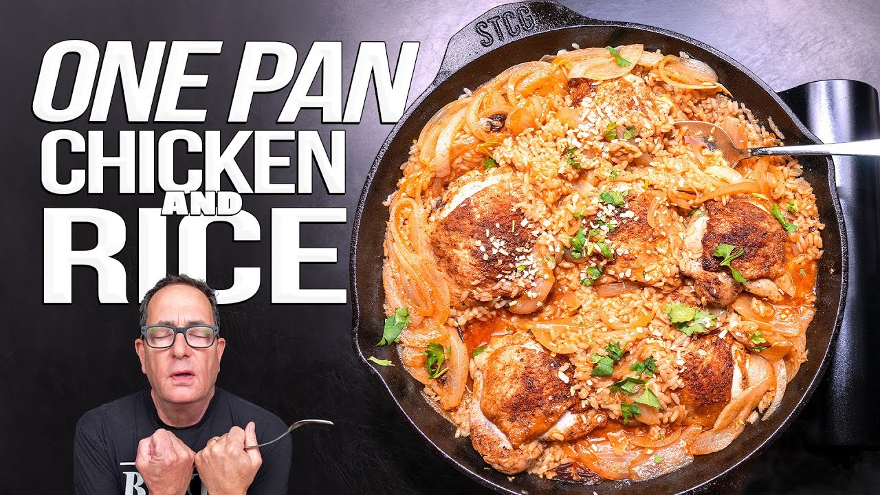 Cold winter nights at the end of the year deserve something super delicious comforting and easy and this chicken in one pan in about 25 minutes is the Answer deeply flavored there’s spices there’s Chipotle chilies there’s rice the whole thing cooks majestically and you only mess up one stinking pan how great is that let me rephrase that and you only mess up one stinking Sam the cooking Guy 12in cast iron pan with my face in the