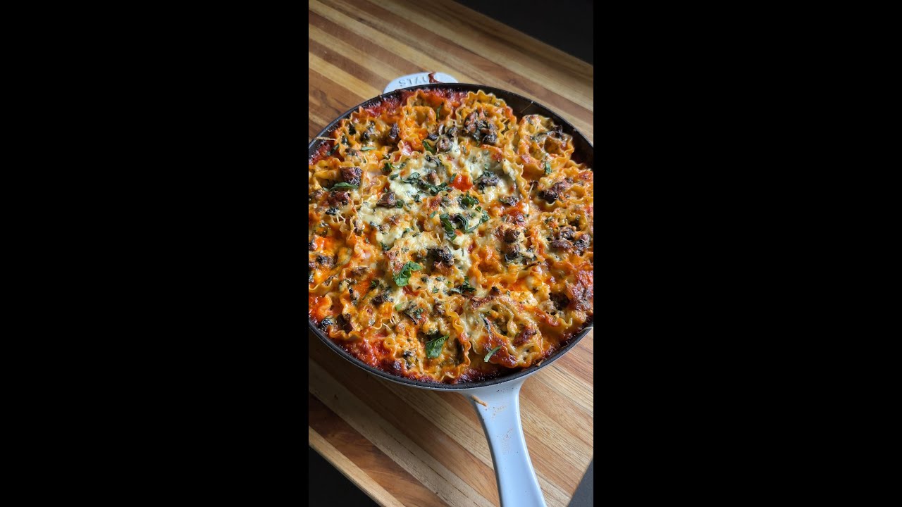 Spread marinara in the skillet. Divide the cheese mixture evenly over each noodle, spreading until smooth. Roll each one up, then cut each in half crosswise with kitchen twine.