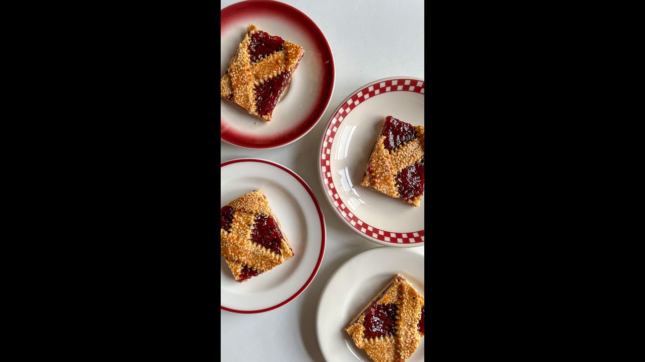 Hear me out. I have a suggestion to make your life way easier this cookie-making season! Instead of making individual Linzer cookies, bake a sheet tray tart and cut it into little bars to save you time and the hassle of making cookies. These bars feature my tart base recipe paired with a homemade sumac-strawberry jam and sesame sprinkle. WOW! You gotta add this treat to your Christmas cookie box, no doubt!