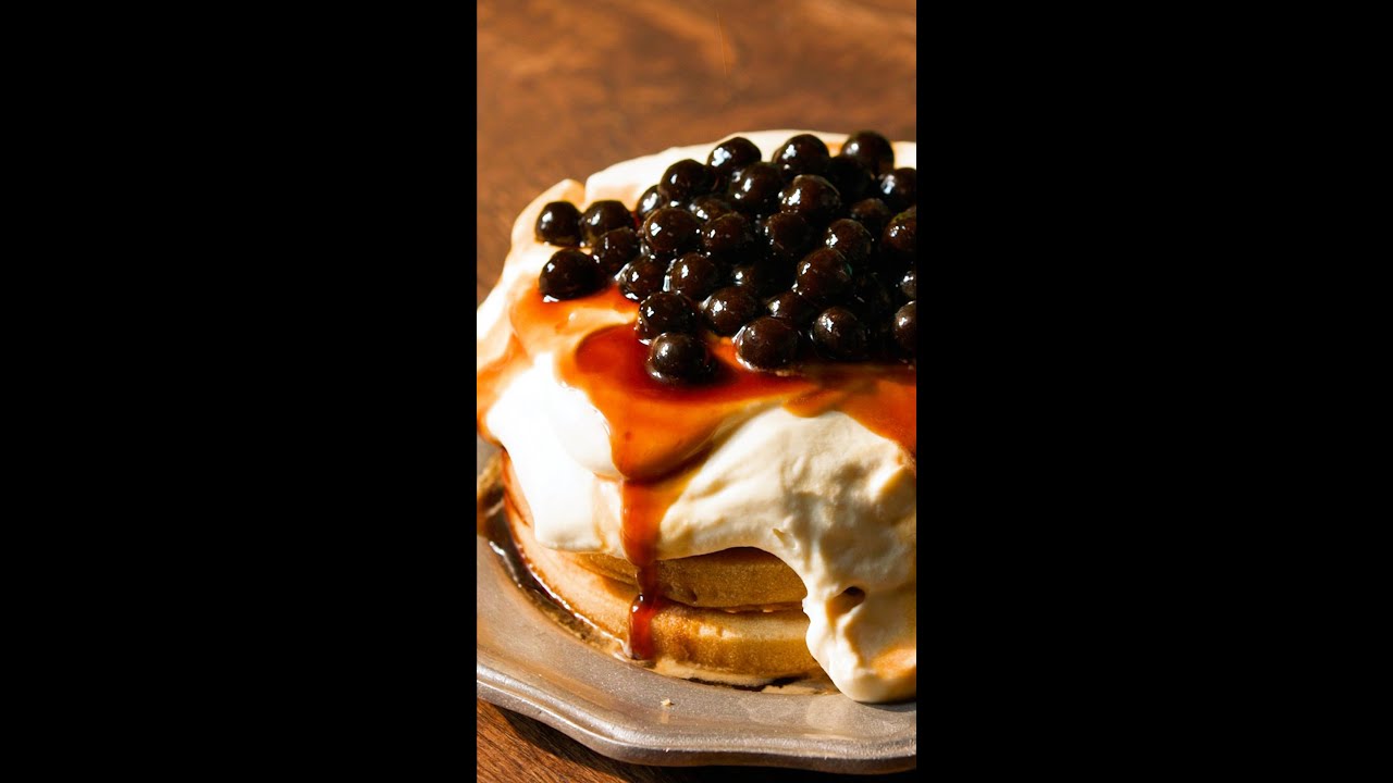On the first episode of Food Flights, Jasmine transports us to Taiwan with these delicious Boba Pancakes with Milk Tea Cream. Recipe link in bio. Recipe link: https://tasty.co/recipe/boba-pancakes-with-milk-tea-cream