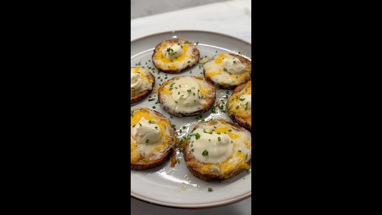 Loaded Potato Bites :potato: Slice a russet potato into ¼-inch-thick rounds. Rinse well and soak in water for at least 30 minutes to remove excess starch. Drain and pat dry the potatoes, then place them side-by-side on a baking tray and drizzle with olive oil. Season with salt, pepper, and garlic powder. Bake in a preheated 425°F (220°C) oven for 30 minutes. Flip the potatoes over and cook for about 15 minutes more, or until crispy. Sprinkle each potato round with cheese and continue baking for 2-3 minutes, until the cheese is melted. Let the potatoes cool, then add a dollop of crème fraîche and garnish with scallions. Enjoy!