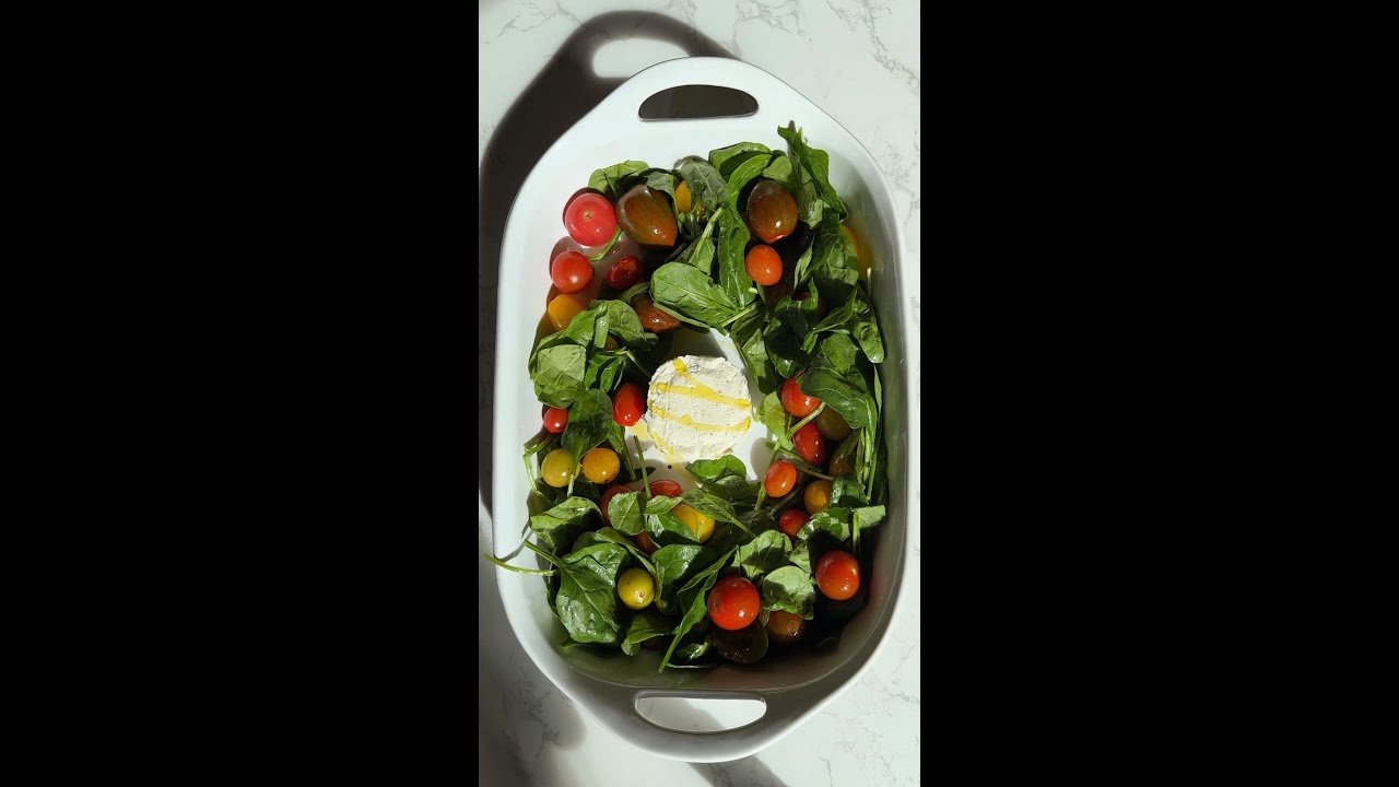 Remember the viral baked feta pasta well this is a spin on it made with Boron garlic and herb cheese instead of feta to a baking dish I add spinach and cherry tomatoes with a generous drizzle of olive oil salt and pepper then mix to C next I add bour and cheese to the