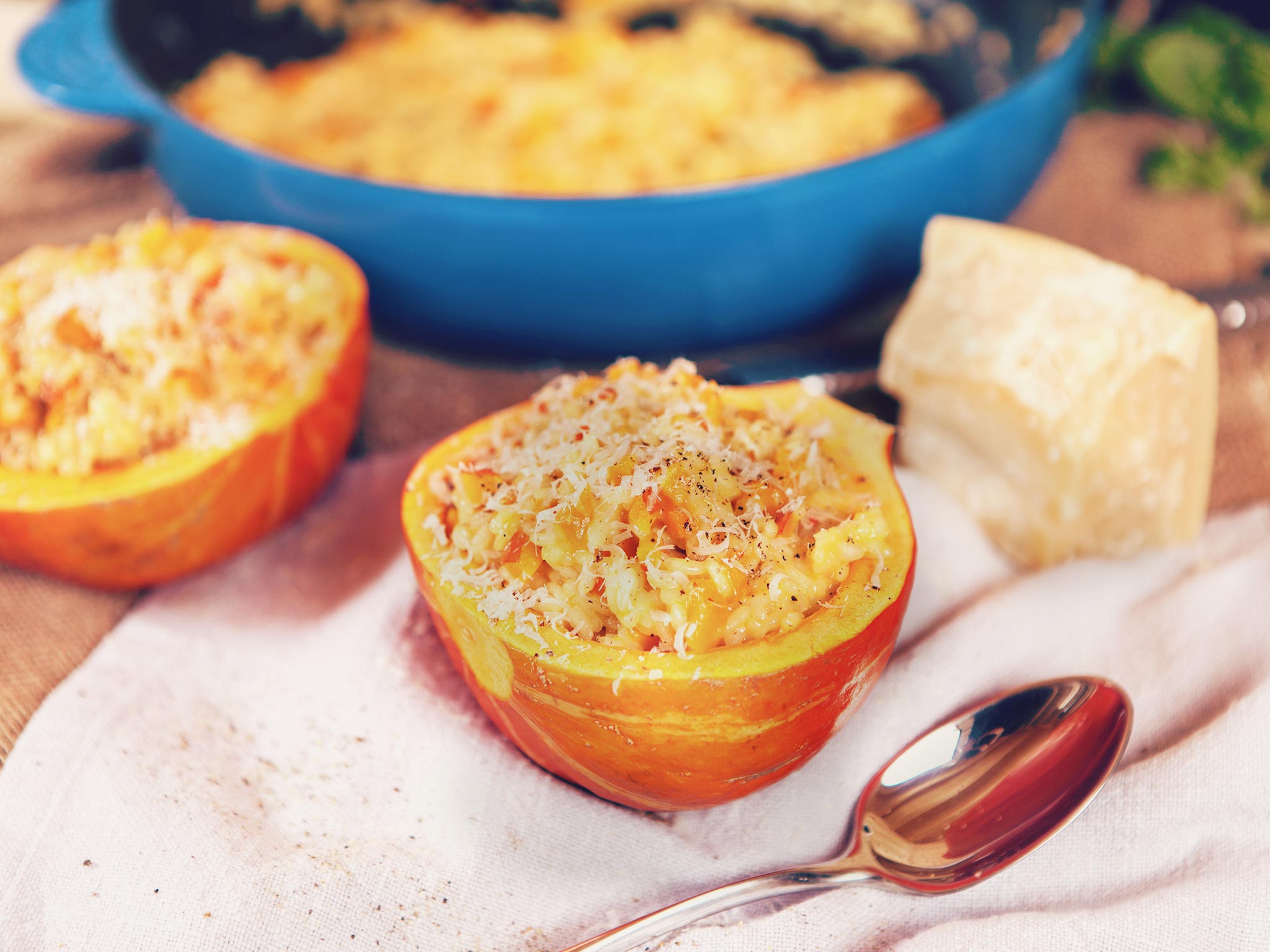 Optionally, you can serve the risotto in a hollowed out pumpkin. To do so, create a little base by cutting a piece of the hokkaido pumpkin from the widest side.