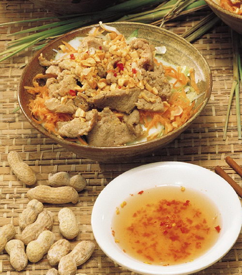This salad is a meal in itself. The combination of hot and cold ingredients and the contrast between crunchy vegetables and soft noodles and meat make this a favorite dish throughout Vietnam, where it is eaten primarily in the summer.