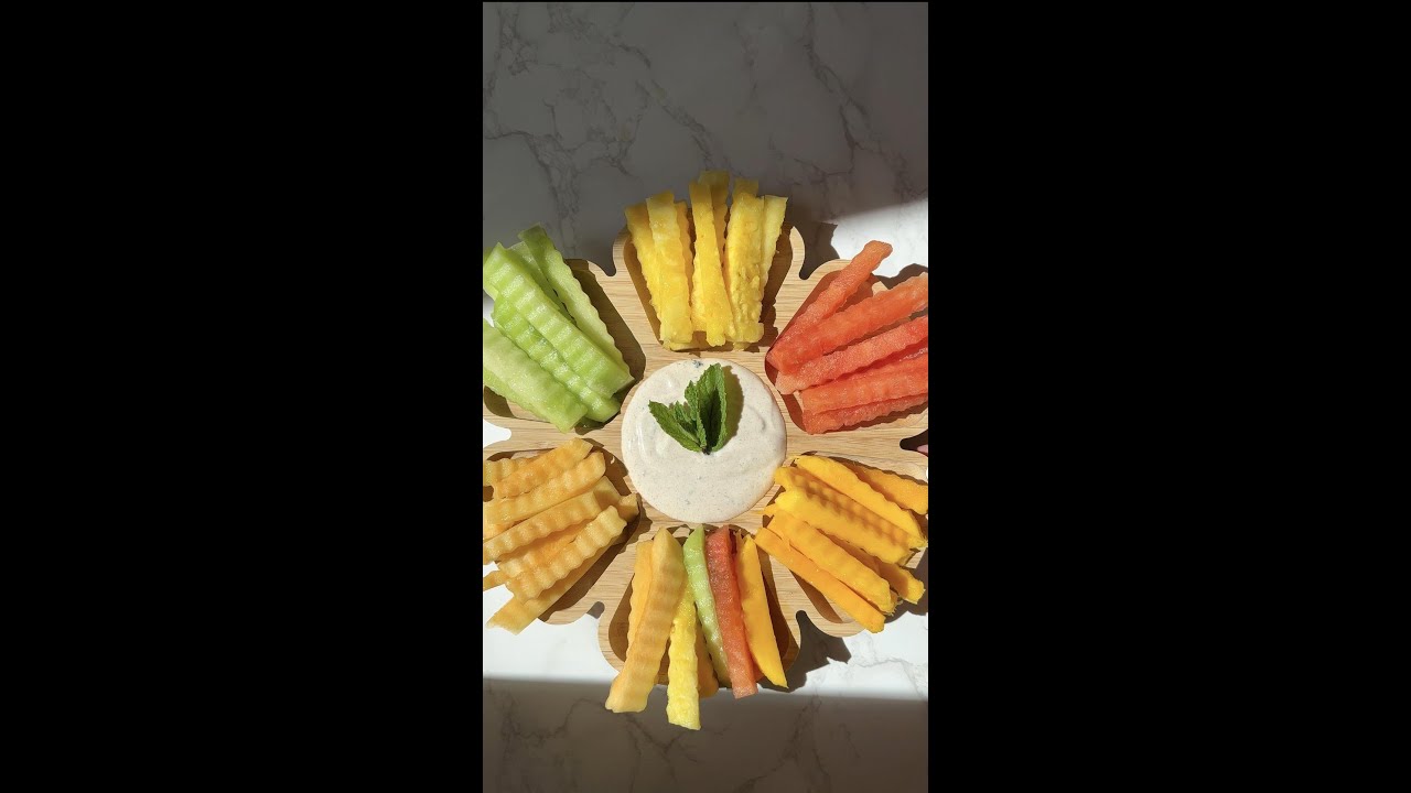 this is such a fun way to serve fruit and it’s simple to make and so cute I like to make this for summer get togethers barbecues or when my daughter has friends over for plats I use a crinkle cutter to slice fresh fruit to resemble crinkle french fries and serve it with a cinnamon yogurt dip if you don’t have a crinkle cutter you can also simply slice the fruit into strips you can use one type of fruit or a variety I used honeydew melon pineapple watermelon mango and cantaloup you can add each fruit to a serving tray individually or mix the fruit fries together for colorful fruit salad fries you can serve the fries with any fruit dip but I like to mix together plain yogurt honey or maple syrup cinnamon vanilla and freshly chopped mint and trust me don’t skip the mint because it really makes this dip Delicious Fruit fries are a refreshing way to enjoy fruit and adds a fun pop of color to any table