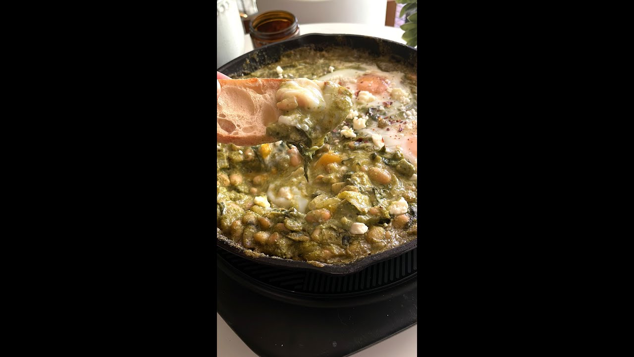 want a saucy breakfast without tomatoes and bell peppers this pesto shakshuka is for you first blend basil garlic pine nuts olive oil lemon juice and salt until they make a creamy pesto and set it aside then sauté onions and garlic and olive oil until fragrant and then add spinach and cook until wilted this dish is great for breakfast brunch lunch and even mix for great leftovers I couldn’t eat it all alone so I’d recommend making it for friends next make Wells with your spatula and crack in an egg season the eggs with salt and pepper and pop it in the oven until the eggs are cooked to your liking serve immediately with crusty bread or pea m