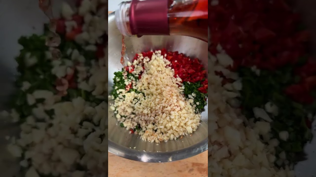 so last year I showed you guys how to make my delicious chimmy cherry recipe and it went viral I still believe this is one of the best sauces of all time it is versatile it’s fresh you can use it on all sorts of proteins you can even make chimmy Cherry butter and use it on potatoes so let’s get into it you’re going to start off by chopping up some parsley nice and fine and then you’re going to take some red peppers I love using Fresno for this recipe and you’re going to chop it up you’re then going to take so much garlic garlic is the best part of this recipe and you’re going to add that all to a bowl along with lemon juice red wine vinegar salt freshly cracked black pepper and some oregano you’re then going to take the best olive oil you can afford and then you’re going to add it until you have this delicious consistency this is so amazing it lasts up to 7 Days in the fridge and the full recipes is on my blog enjoy