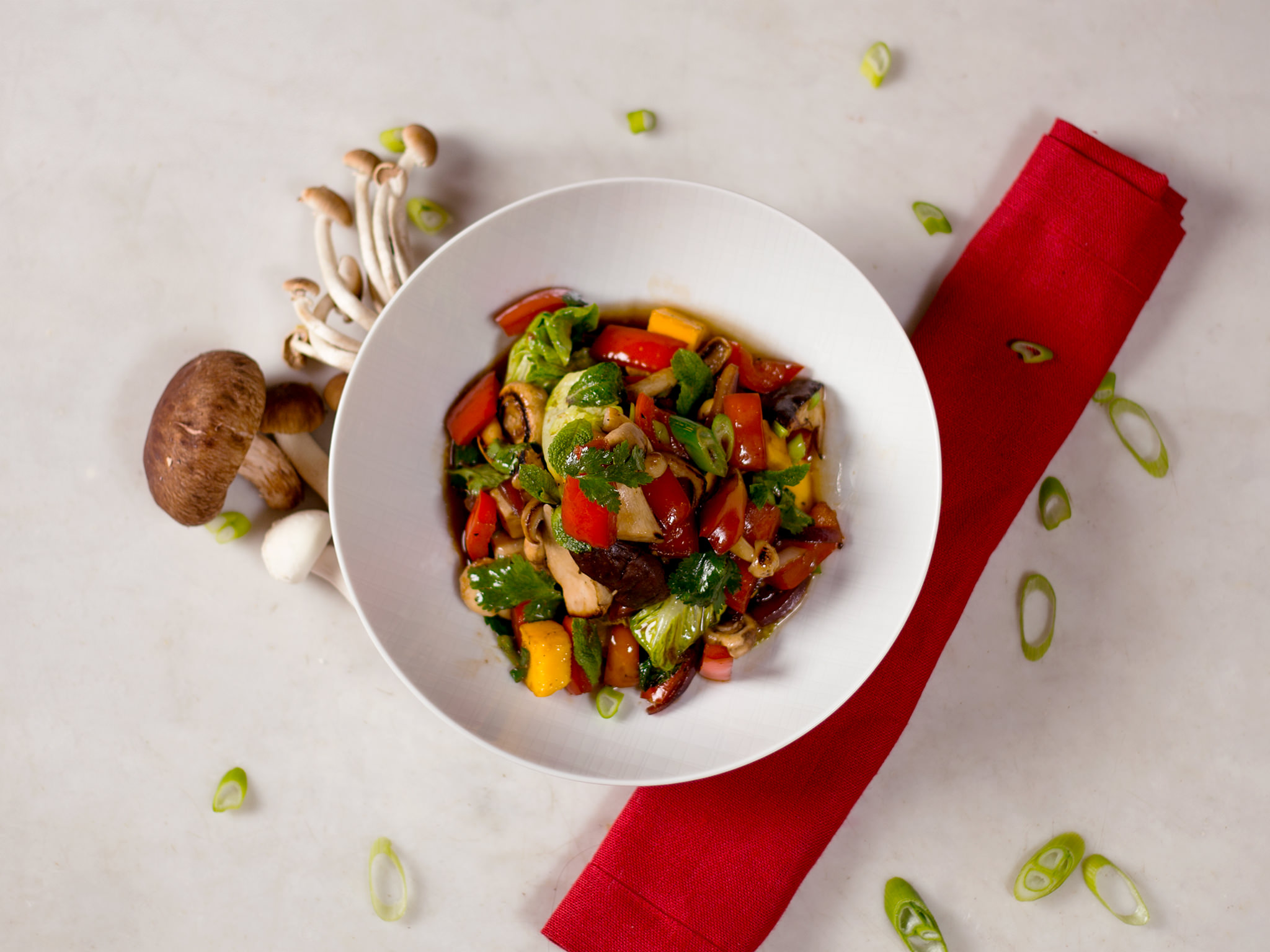 Slice spring onions and finely chop onion and garlic. Cut romaine hearts, bell pepper, wild mushrooms, and mango into bite-size pieces.