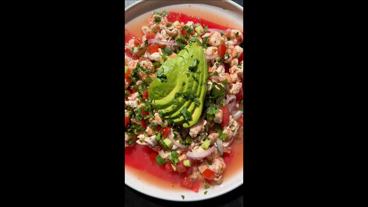 Super Fresh watermelon shrimps the vich guys this is perfect for the summertime first we’re going to start off by cutting your peeled and de vain shrimp into small pieces then we’re going to juice lemons and limes into the bowl the acidity is going to cook the shrimp and we’re going to let that marinate for like an hour next we’re going to prepare our cucumbers Tomatoes red onions Sano peppers and cut the watermelon into a rectangle then use a large vegetable peeler to make thin slices add all the vegetables to a bowl with cilantro tomato juice and a few dashes of fish sauce this really adds some great flavor this kind of gives watermelon Caraco meat shrimps to viche I like to fry fresh chips and garnish with a fresh avocado this recipe is so light and fresh and delicious definitely give it a try