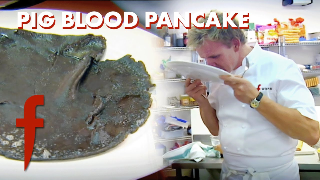 Janet Street-Porter introduces Gordon Ramsay to blood pancakes and persuades him to try a straight shot of pig’s blood.