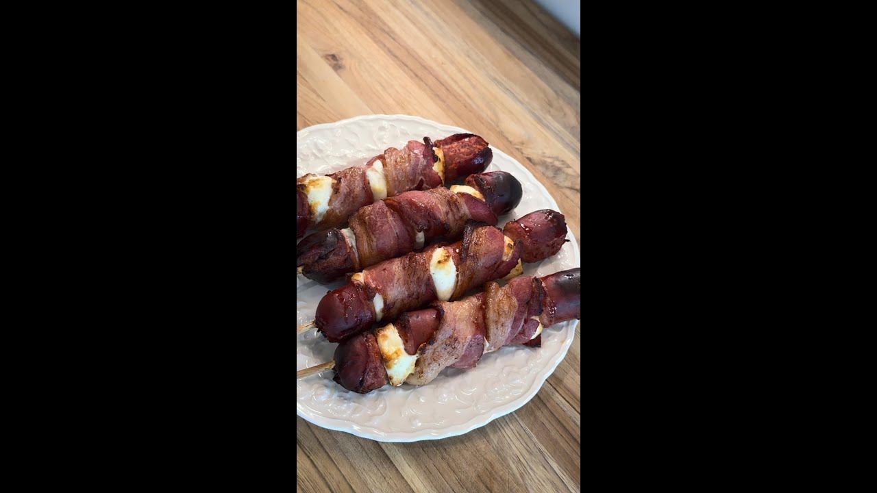Servings 8 INGREDIENTS ½ white onion, thinly sliced 2 medium green bell peppers, thinly sliced 2 medium red bell peppers, thinly sliced 1 tablespoon vegetable oil 8 hot dogs 8 slices bacon 10 oz panela cheese 8 toasted hot dog buns, for serving Mayo, for serving Ketchup, for serving Mustard, for serving Special Equipment 8 long wooden skewers PREPARATION Heat oil to a large skillet over medium heat. Add bell peppers and onions; sauté until onions are caramelized and bell peppers are softened, about 10 minutes. Use the hot dog as a guide to cut your cheese into sticks the same width of the hot dog. Then slice the cheese sticks into ¼-inch slices. Cut your hot dogs into 4 equal parts. Using wooden skewers, thread the hot dog and cheese onto the skewer, altering between the two ingredients. Then carefully wrap the skewered hot dog in a slice of bacon. If needed, trim the skewers down so they fit in the air fryer. Preheat the air fryer to 380°F (193°C). Add hot dogs to the air fryer and cook until the bacon is crispy, about 12-14 minutes, flipping halfway through. Add hot dogs to a toasted bun and remove the skewer. Top with desired condiments and cooked veggies. Serve and enjoy babe!