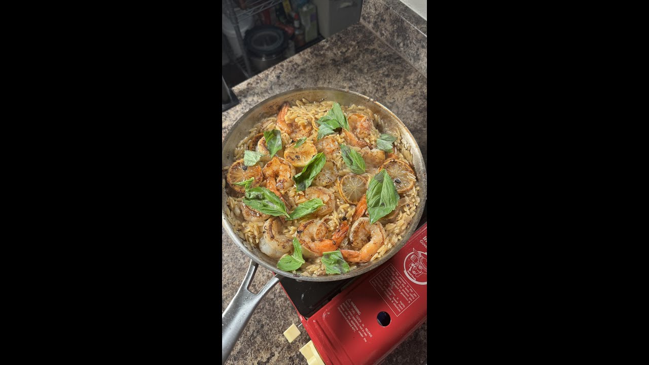 1 pound large shrimp, peeled and deveined ½ teaspoon kosher salt, plus more to taste ½teaspoon pepper, plus more to taste ½ teaspoon garlic powder 1 tablespoon neutral cooking oil 1 lemon, sliced ½ yellow onion, diced 6 garlic cloves, minced 3 fresh oregano sprigs 1½ cups uncooked orzo ½ cup dry white wine 2 cups chicken broth Fresh basil, for serving