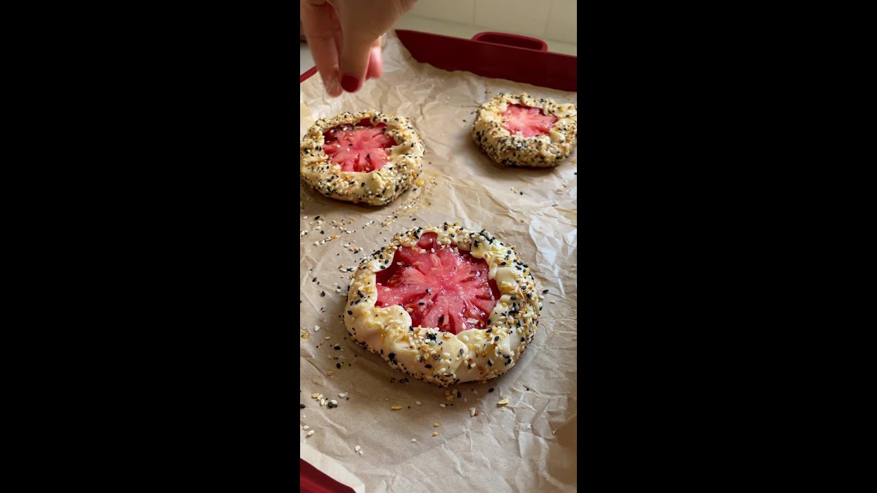 Handheld Tomato Galettes with a flaky crust and juicy heirloom tomatoes. Enjoy this savory summer treat anywhere! Find the recipe linked in bio @groovyfoodiess