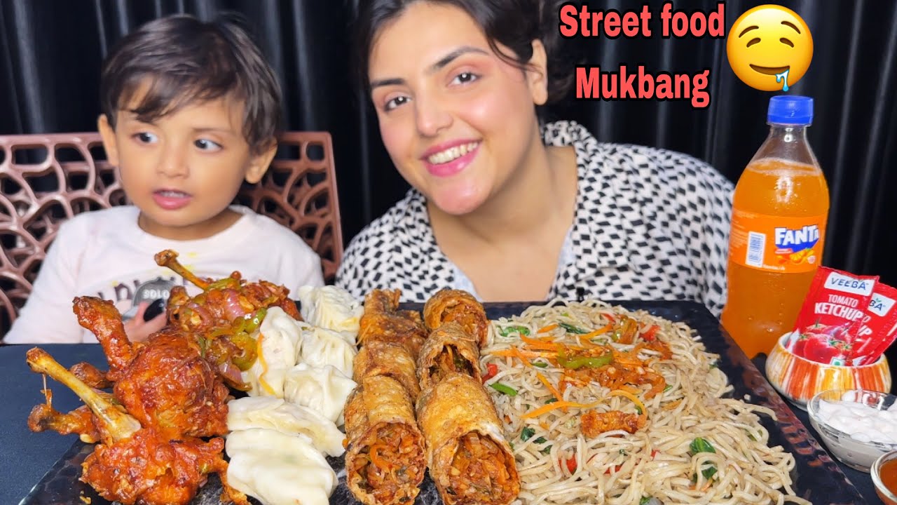 Indian Street food Mukbang: Chicken Lollipop, Chicken Dumplings 🥟, Spring Roll, Veg Hakka Noodles