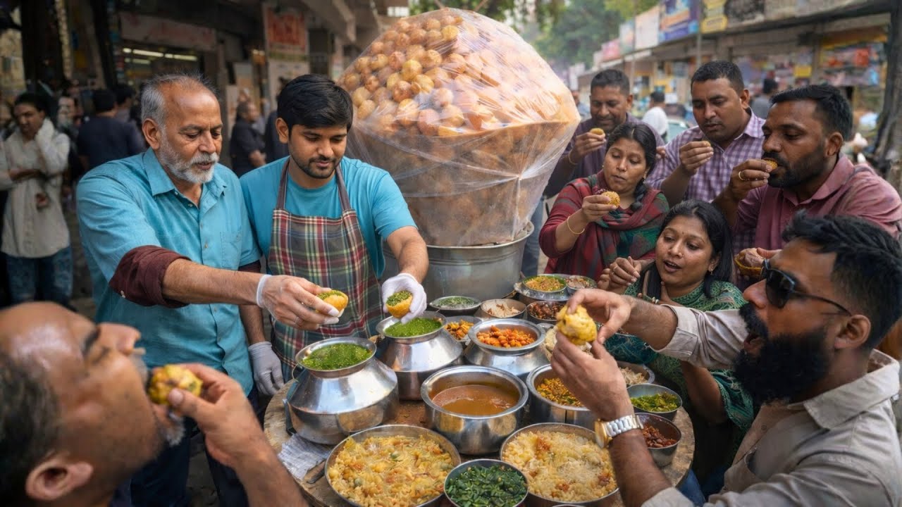 Watch how a grandpa and his grandson run a tiny roadside golgappa (pani puri) stall while serving hundreds of customers nonstop. From crispy puri shells to spicy green pani and masala fillings — this Indian street food documentary shows the full golgappa making process in real time.