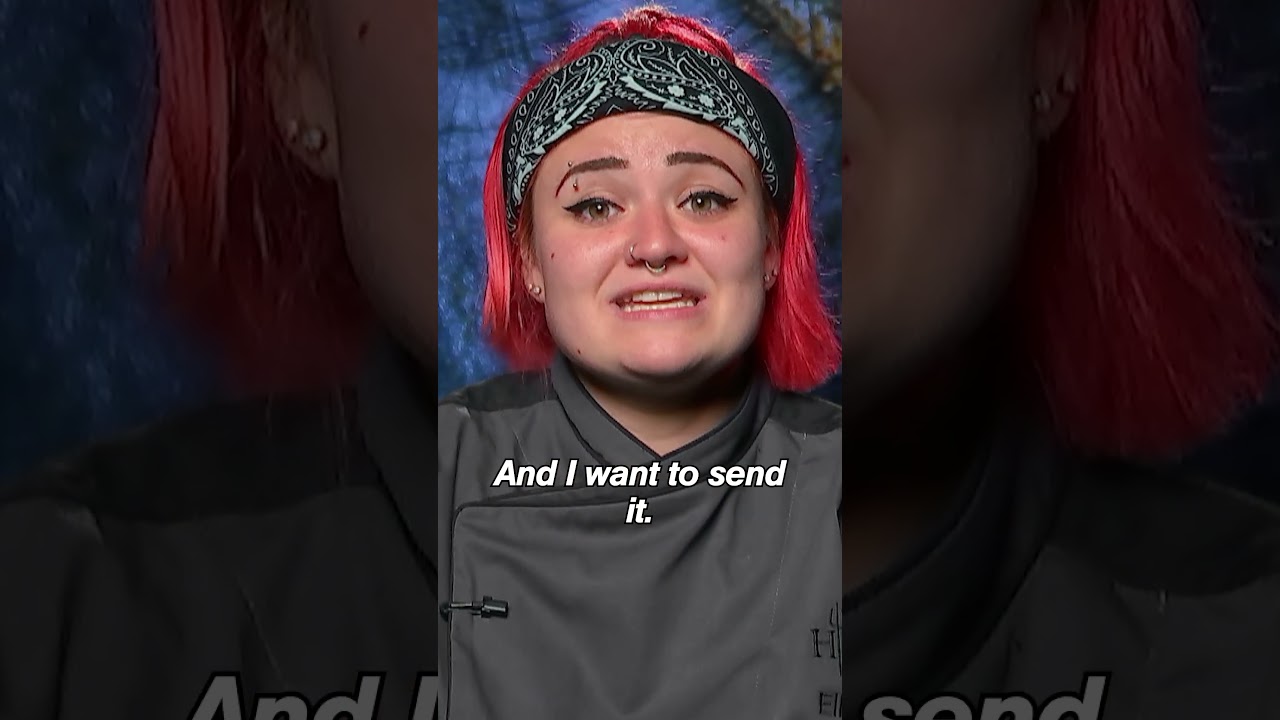 gordon ramsay calls out chef ellie’s chicken for being overcooked but ellie cuts into it to check for herself and makes the decision to send it out to the table anyways.