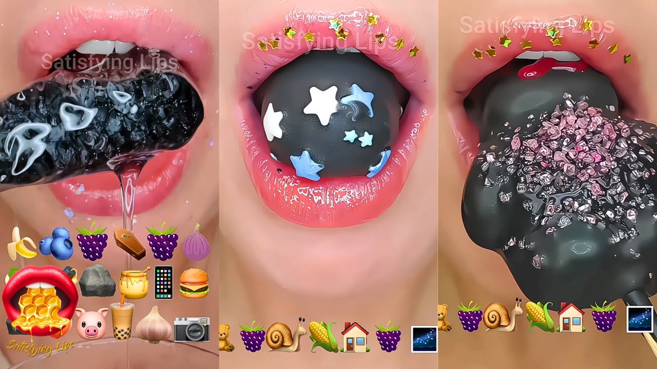 ASMR satisfying eating emoji food challenge, eating just black foods Mukbang eating many different tasty snacks, Jelly, raw honeycomb Fruit and more!