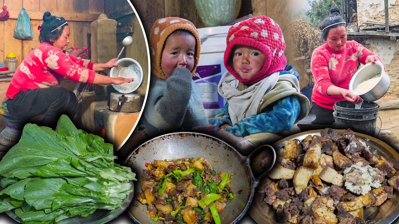 Green Mustard (RAYO) & Pork Recipe with rice Cooking & eating in Village Kitchen || pork rice eating || New Nepali Village Food Vlog