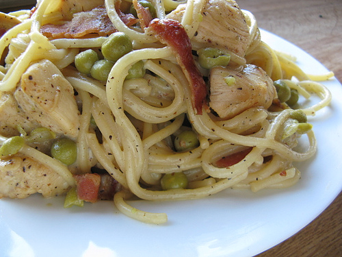 It’s been awhile since I had some Italian food and Chicken Carbonara sounded great, and indeed it was. If you are not familiar with chicken carbonara is it basically a type of chicken spaghetti. Pasta noodles, with chicken and bacon in a delicious parmesan sauce. The only other thing I added to the recipe was peas, but mushrooms and onions would be a great addition as well. Now the recipe does call for raw eggs in the sauce so what you are going to want to do is mix the sauce in the piping hot noodles right after you drain them. This will kill any bacteria. Serving with garlic bread is a must. Enjoy.