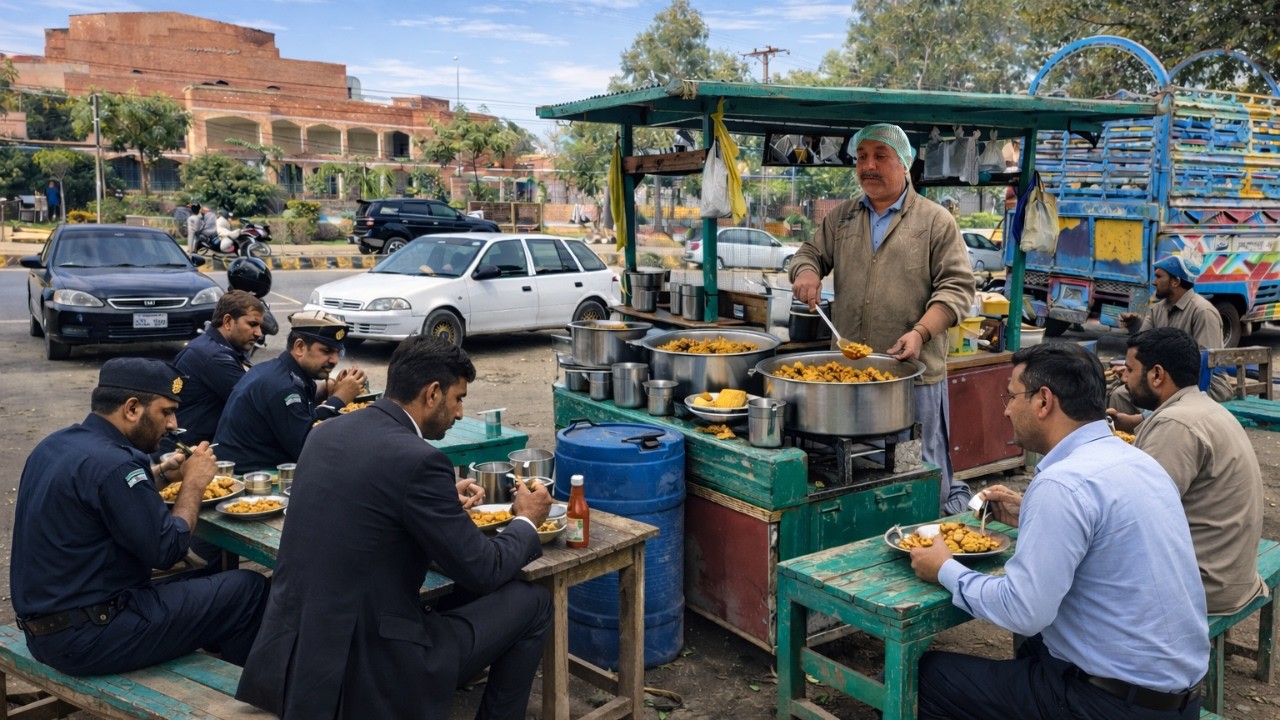 A peaceful Pakistani morning comes alive outside Arts Council Sargodha, where a small roadside dhaba becomes a meeting point for the city. From police officers and lawyers to office workers and daily visitors, everyone gathers here for a simple but powerful desi breakfast — Channay Chawal served hot, fresh, and with honesty.