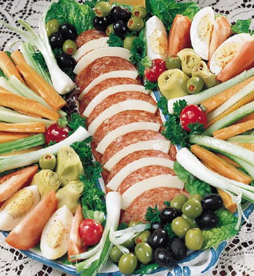 *To serve a lighter antipasto, you may choose to add more vegetables and omit or reduce the amount of meat and cheese. Also try varying the ratios of ingredients in the dressing. For example, to make a refreshing, zingy dressing, use only 1/2 c. olive oil and increase the amount of lemon juice to 1/2 c.