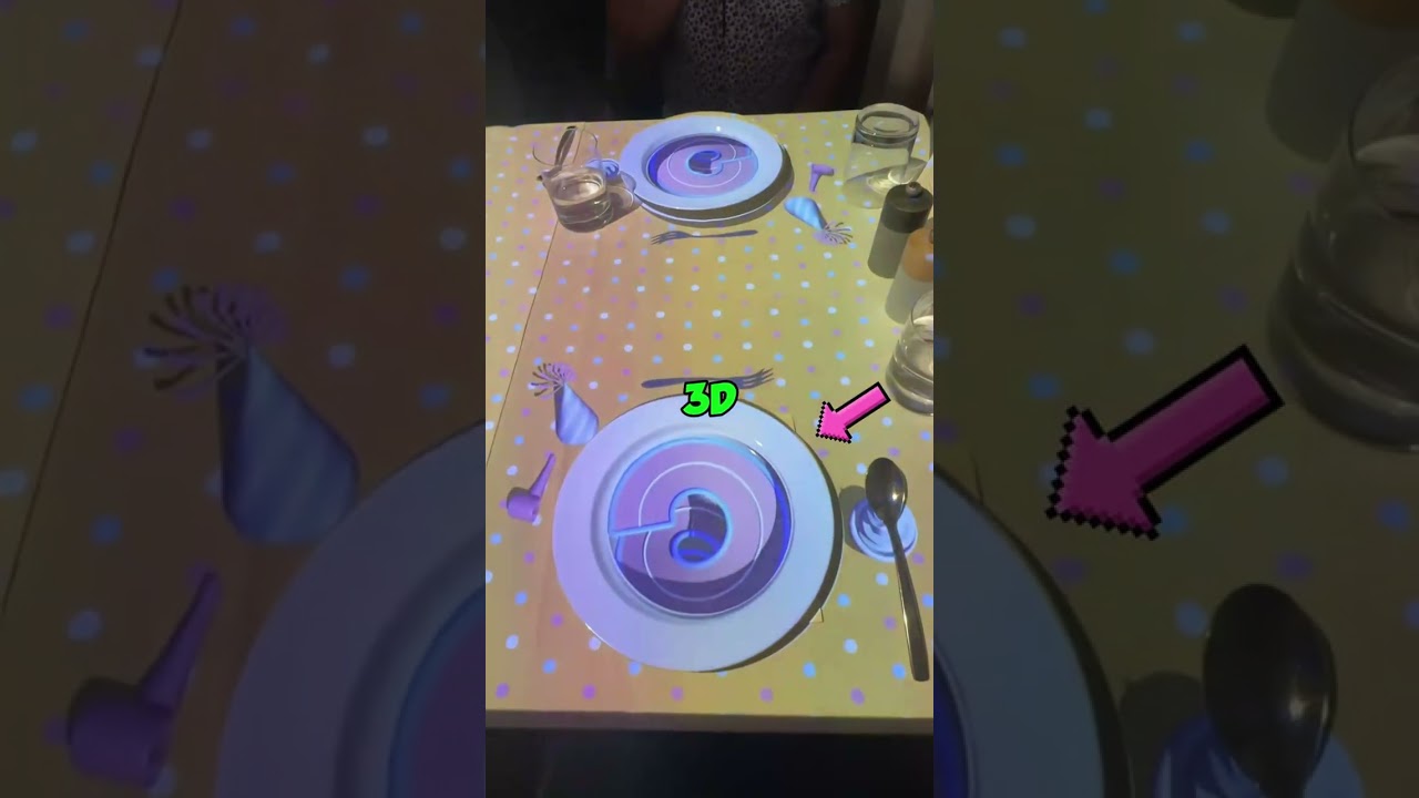A restaurant uses 3D projection mapping technology on tablecloths to display animated mini chefs preparing food creating an interactive visual show while guests wait for their meal.
