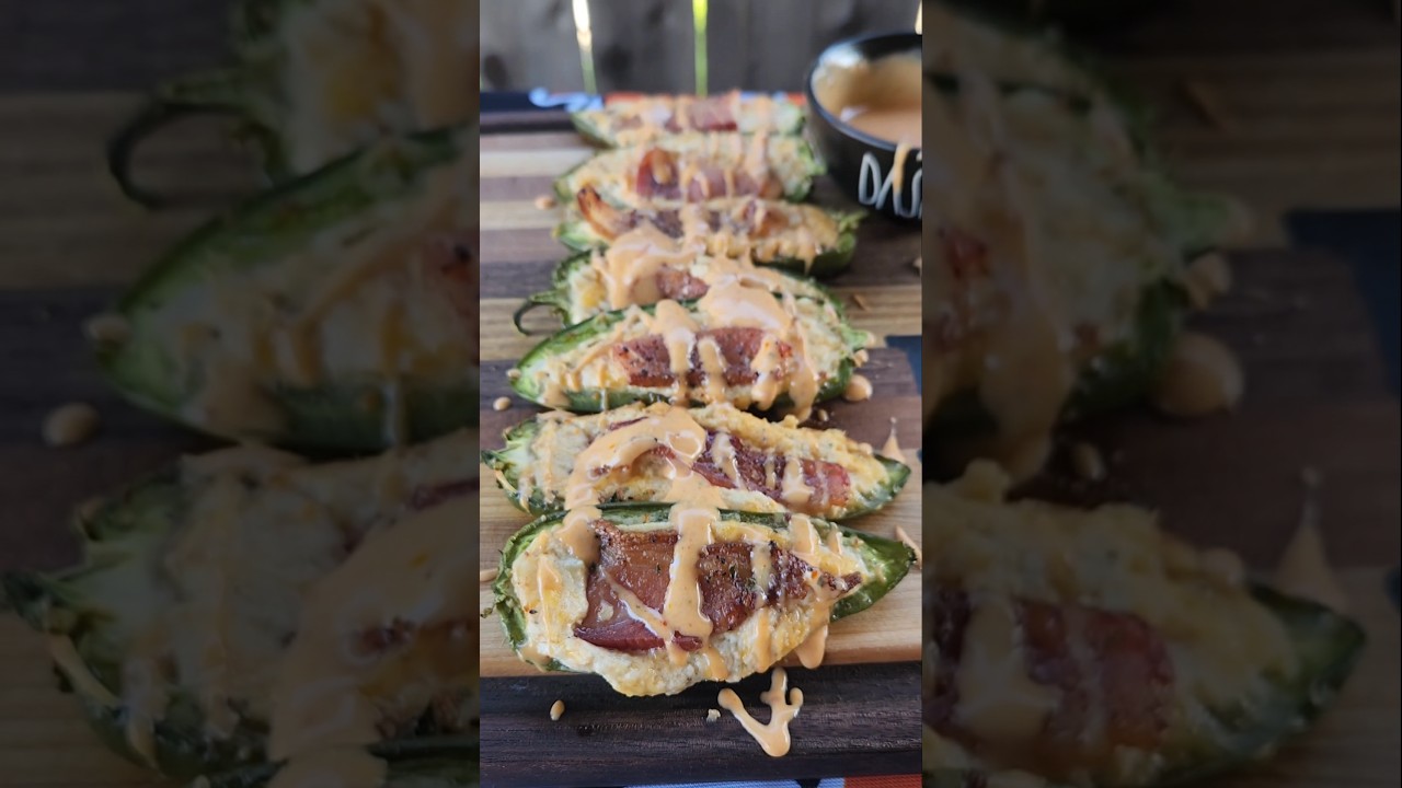 Just the start to another delicious Traeger gameday classic! These poppers were topped off with a spicy honey ranch and are a great way to start off your super bowl Sunday. For these, I mixed together softened cream cheese, shredded cheddar and DD All Purpose. I halved my jalapeños then removed the seeds and membranes and filled them with the cheese mixture. I laid a slice of bacon on top then sprinkled it with more seasoning. They went on the Traegergrills at 225 until the bacon was crisp. While they cooked I made up my sauce by mixing together ranch, mikes hot honey and chili crisp (3:1:1). I pulled my poppers and laid them out. They were drizzled with sauce and served immediately. Stay tuned for more delicious game day eats!