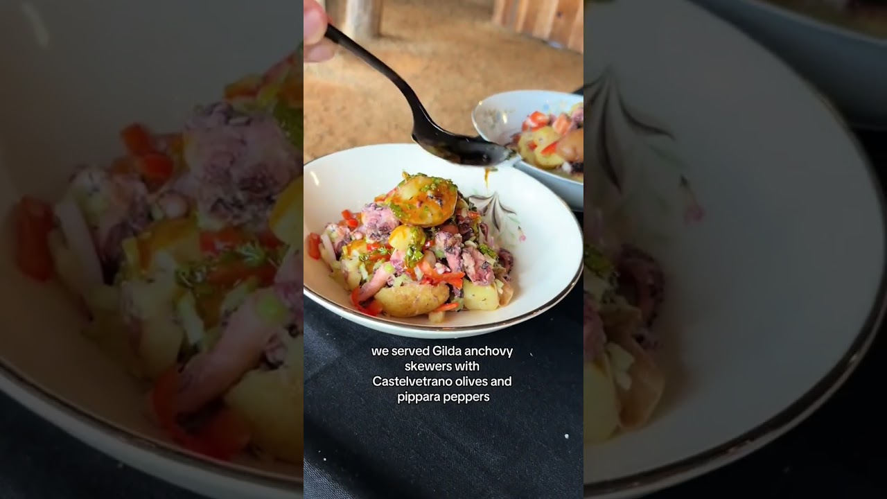 The menu: Amusebouche: Octopus & pearl onion skewers On the table: Thyme roasted marcona almonds