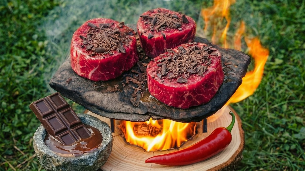 This video combines bushcraft cooking and fine dining as a thick filet mignon steak is prepared over a handmade log rocket stove and seared directly on a heated stone. Using primitive outdoor tools and natural materials, a simple tree stump becomes a functional cooking station in the wild.