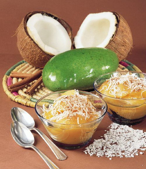 3. To serve, place mango in a dessert dish or fruit cup. Top with coconut and sprinkle lightly with cinnamon.