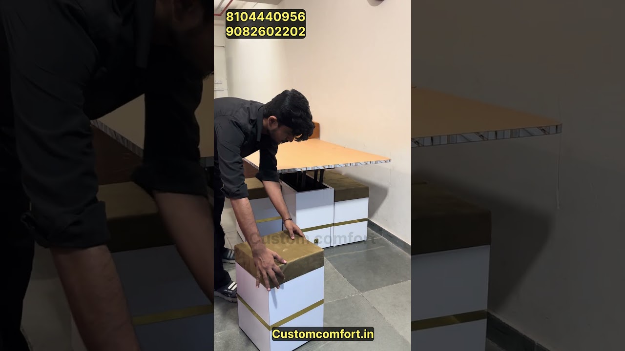 *Space-Saving 2-in-1 Lift-Up Coffee Table cum Dining Table with 4 Puffy Stools & Storage!* @custom__comfortTransform your living space with our innovative lift-up coffee table that converts seamlessly into a dining table, complete with 4 puffy stools featuring storage compartments. With:- *1000+ colour options:* Choose from a vast palette to match your home decor.- *Size customisation:* Tailor the table and stool dimensions to fit your space.- *Design customisation:* Select from various designs to suit your style.- *Delivery across India:* Get this versatile piece delivered to your doorstep.Perfect for small #customcomfort homes, apartments, or studios, our 2-in-1 table offers flexibility, comfort, and practicality. Create your dream piece today and enjoy effortless entertaining!For more details please contact 8104440956/9082602202#spacesavingfurniture #spacesavingdiningtable #covertablediningtable #expandablediningtable #centretablecumdiningtable furnituremaker reels reelsinstagram reelitfeelit trending furnituremaker customcomfort foldablediningtable covertablediningtable diningtableset spacesavingdiningtable
