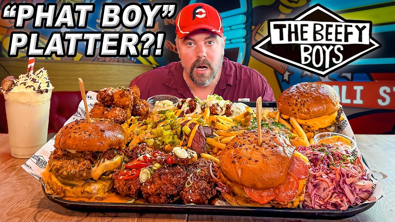 American professional eater Randy Santel versus The Beefy Boys’ supersized and fabulous “Phat Boy” Burger Platter Challenge at The Beefy Boys location in Bath, Somerset, England, United Kingdom!! After finishing up the long Central European food challenge tour with @KatinaEatsKilos, we both flew to London, England to celebrate her 34th birthday and then spent a few weeks attempting huge and delicious man vs food eating challenges all around England!! For restaurant food challenge #13 of fifteen (15), we headed to The Beefy Boys location in Bath, Somerset so we could each take on their “Phat Boy” Burger Platter Challenge!! The “Phat Boy” Platter is a menu item available at all five locations, meant for groups of 2-4 people to split amongst themselves, but brave individuals can challenge themselves to finish everything with a base 30 minute time limit. You get to choose two classic burgers from the menu, which come with Mega Mac Balls (deep fried macaroni & cheese balls), Bacon Fries, Millionaire Fries, coleslaw, chicken tenders of your choice, and chicken wings of your choice, from their list of tasty options. Thanks to you all watching, The Beefy Boys allowed me to promote some of their larger deluxe, gourmet / craft menu items, including a third optional cheeseburger and a Kinder Bueno Milkshake for dessert. For my “Phat Boy” Platter, I ordered their award-winning “Oklahoma Onion Boy” Burger, their “Pizza Boy” Burger, and their “Chili Cheese Boy” Burger, along with Mac & Cheese Balls, Ninja Chicken Tenders, Pastrami Fries, Canadian Poutine Fries with chicken gravy, BBQ & Ranch Chicken Wings, and creamy British coleslaw. Normally, this is a pay-to-play food challenge that costs £65 whether you win or lose. Also thanks to you all watching, I was trying to win my meal free plus a sweet T-shirt, coffee mug, hat, and Beefy Boys swag bag, plus a spot on the Bath location’s “Phat Boy” Challenge Wall of Fame!! BIG thanks to everyone with The Beefy Boys for the wonderful food, drinks, dessert, and hospitality!! Special thanks also to all our friends who came up that Wednesday evening to watch and meet us!! We appreciate everyone in England and all around the United Kingdom who watches videos and supports our hard efforts!!