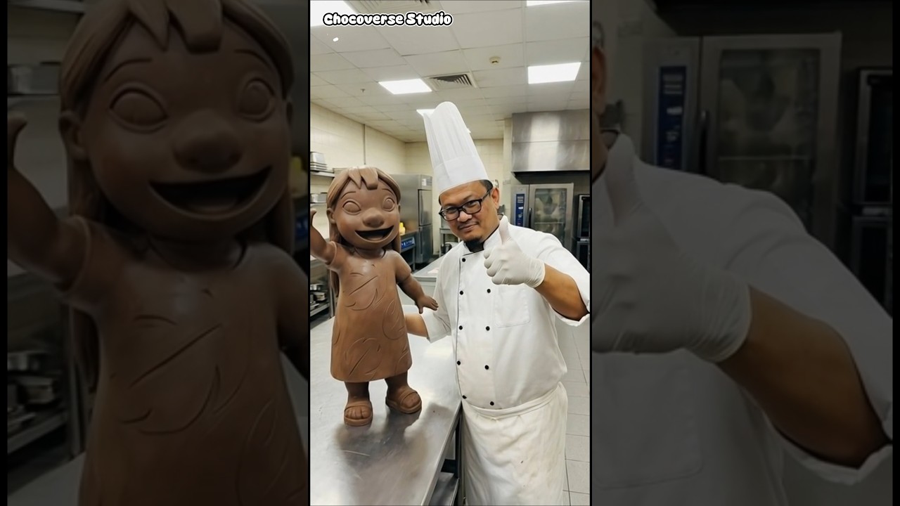 In this video, a professional chef wearing a white chef hat, white uniform, and white rubber gloves creates a 100 cm full-body Lilo chocolate statue from scratch. Starting from mixing melted chocolate, shaping a 15 cm head, sculpting a 60 cm body, forming the legs, until the final masterpiece is complete โ all done in a clean kitchen environment.