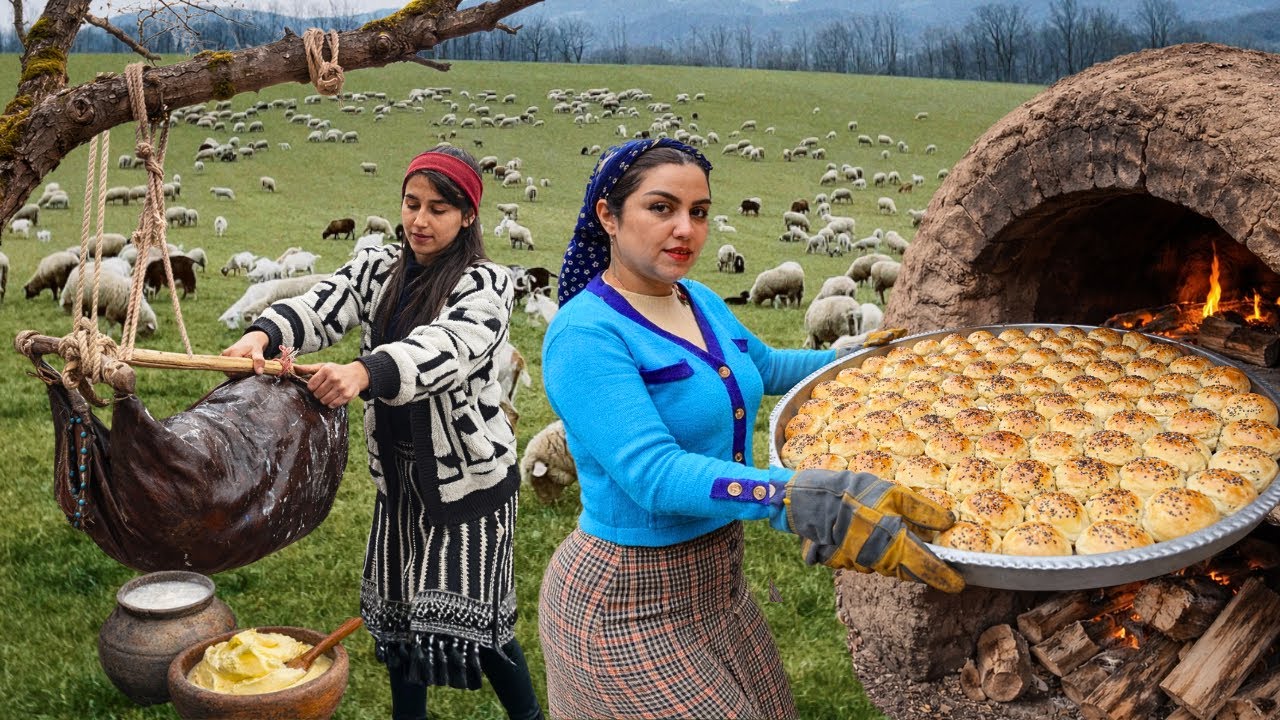 Meanwhile, Negin uses a traditional goatskin churn (mashk) to turn fresh yogurt into buttermilk and local butter. The mashk, made from natural goatskin, is shaken patiently until golden butter separates from the yogurt — a beautiful traditional dairy process passed down through generations 🐄🧈