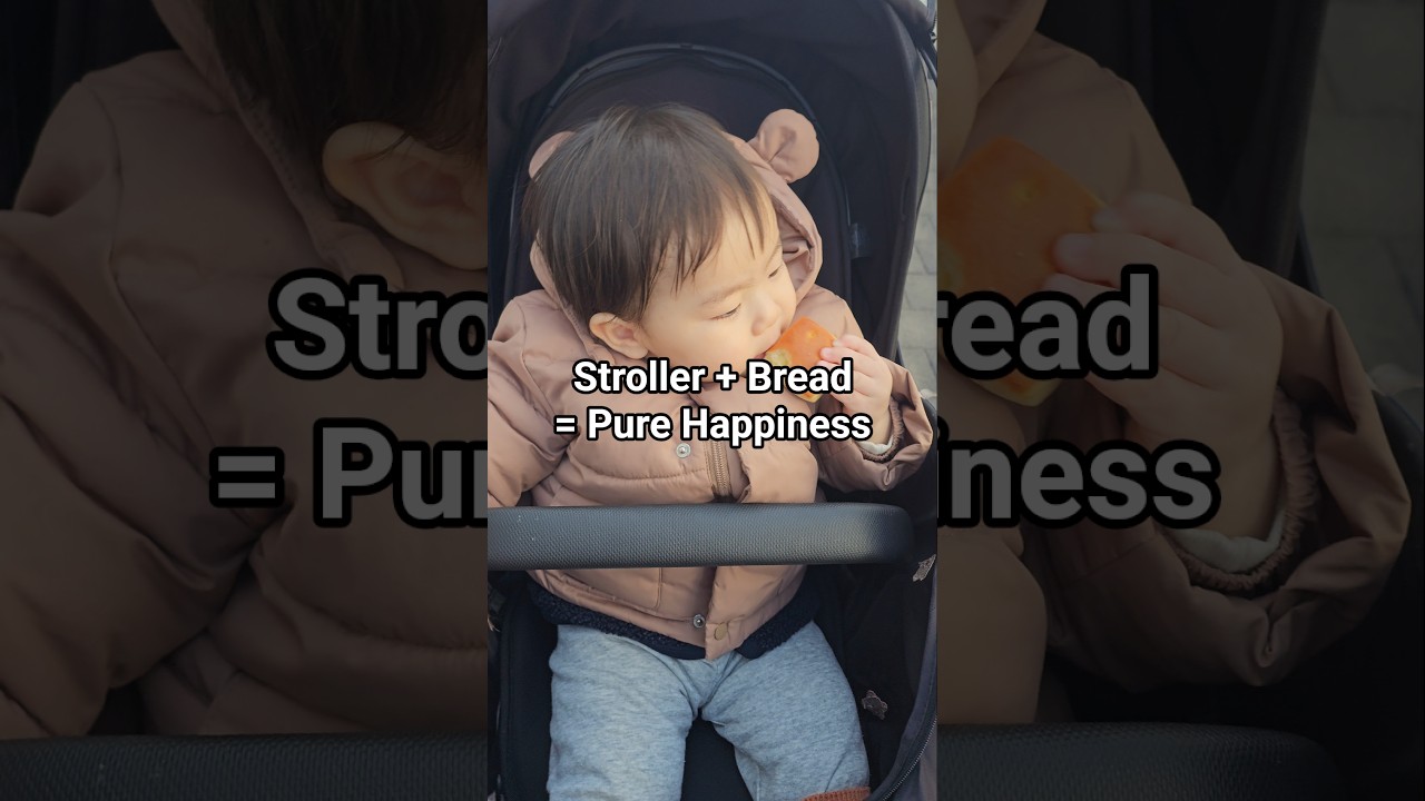 Sitting comfortably in the stroller.Enjoying bread like itโ€™s fine dining. ๐Ÿ˜‹