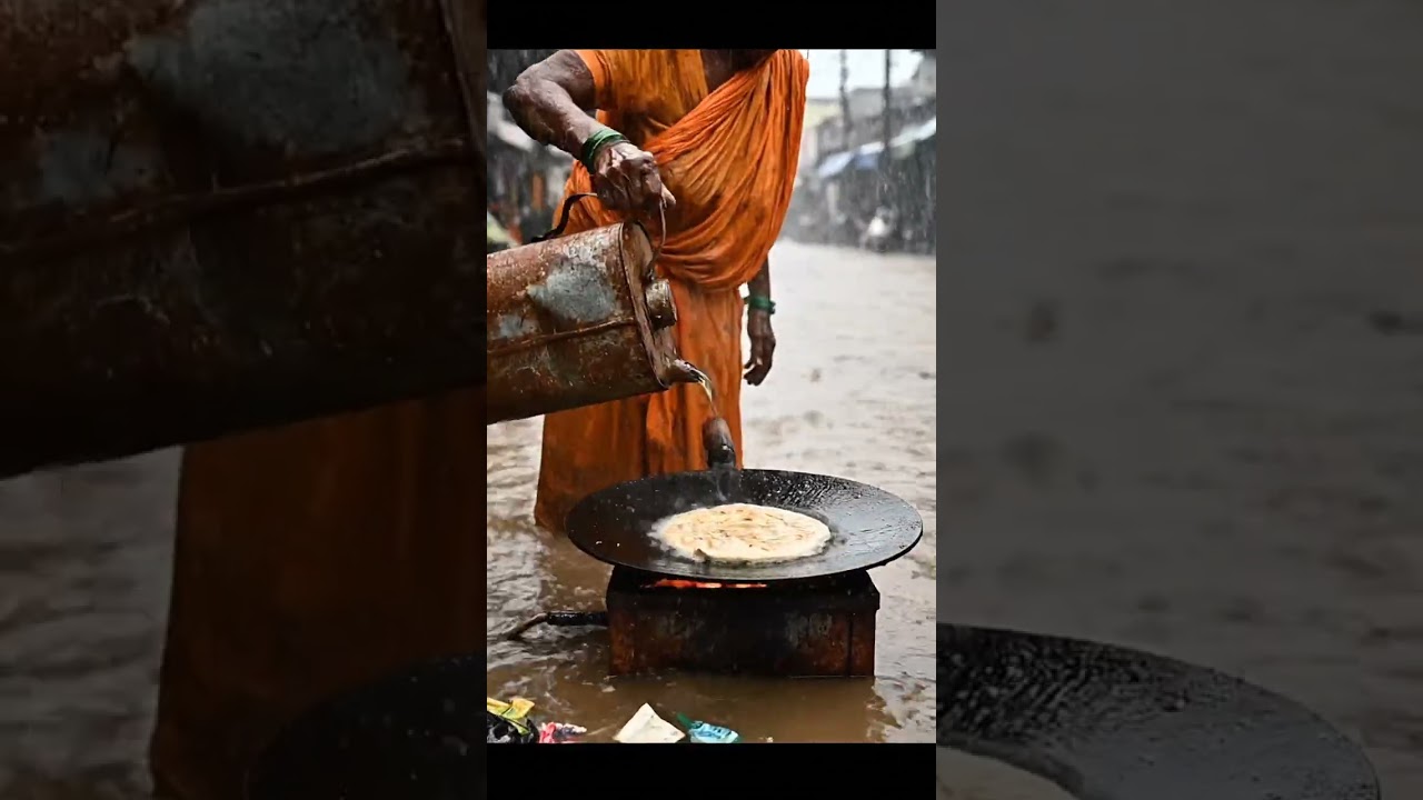 Budhi Ammi Cooking Paratha in Flooded Street | Rain, Fire & Survival Village Scene #FloodCooking